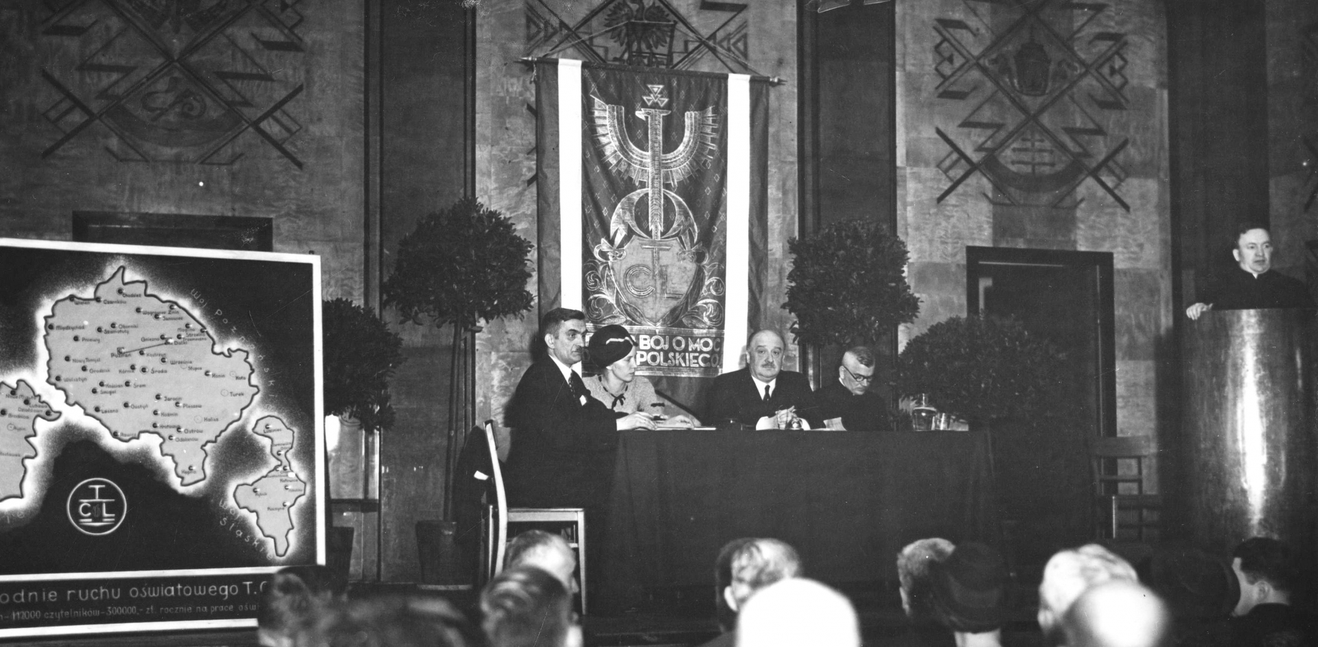 W prezydium sejmiku widoczni m.in.: prezes TCL Adolf Bniński (2. z prawej) i prezes TCL ks. Antoni Ludwiczak (1. z prawej). Przemawia dyrektor TCL ks. Karol Milik.