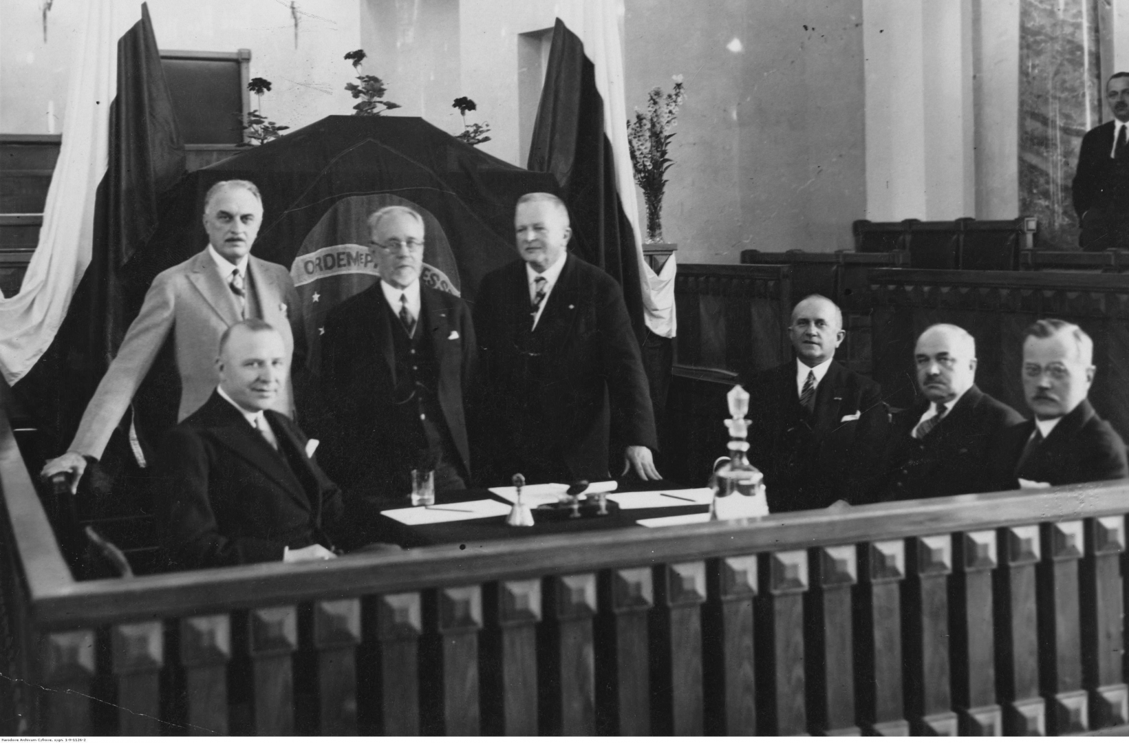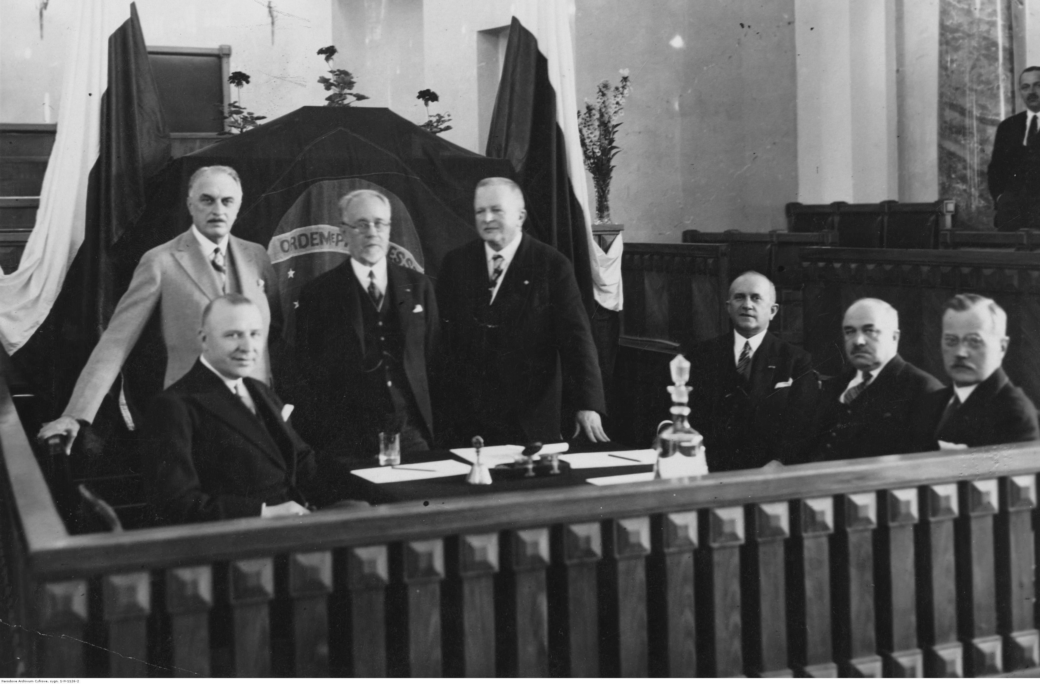 Widoczni od lewej: minister sprawiedliwości Stanisław Car (siedzi), poseł brazylijski Alcibiades Pecanha, prof. Rodrigo Octavio de Langard Mazenes, marszałek Senatu Julian Szymański, prezes Polskiej Komisji Międzynarodowej Współpracy Intelektualnej prof. Karol Lutostański, NN, wiceminister spraw zagranicznych Alfred Wysocki.