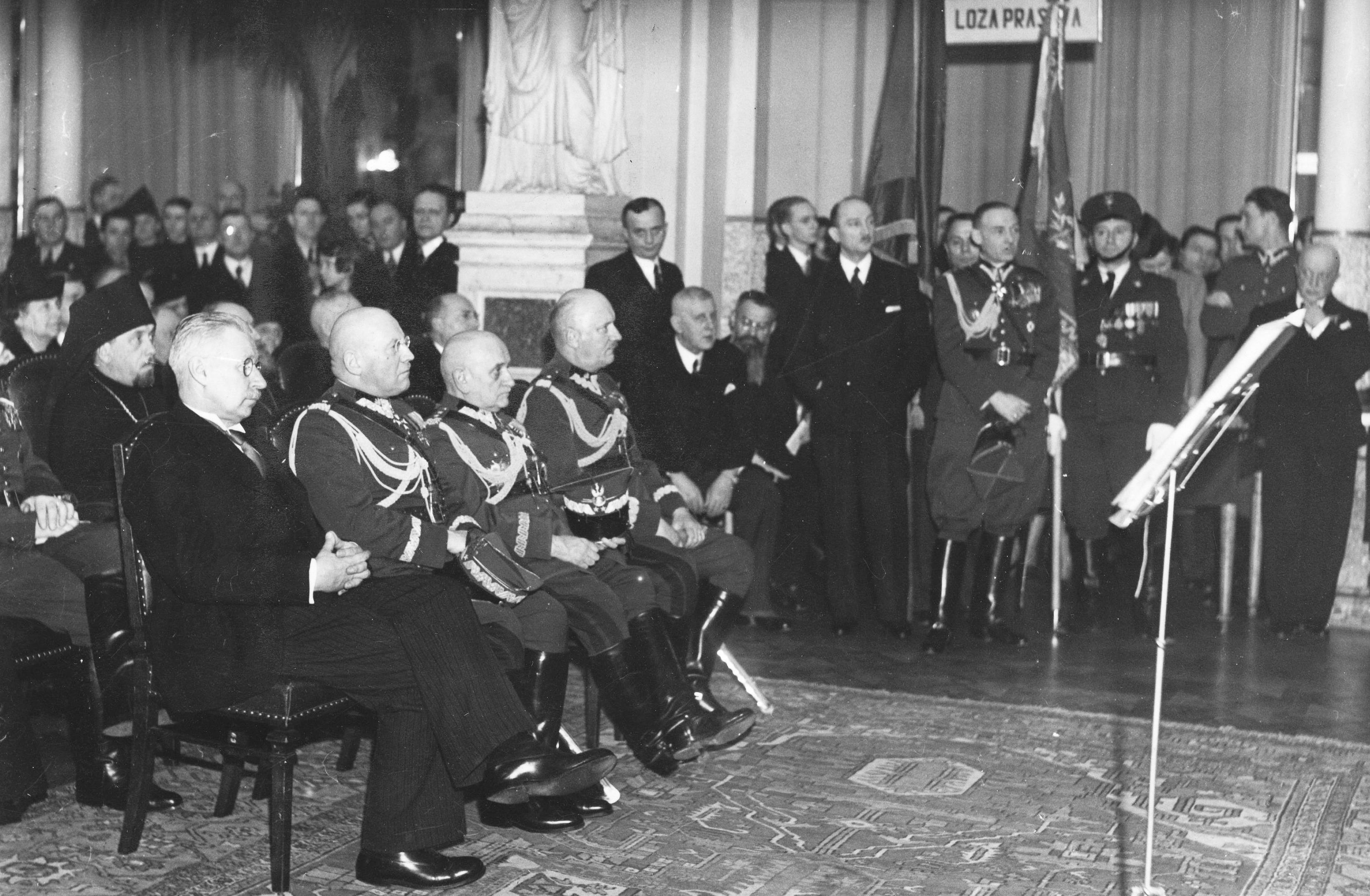 Widok ogólny sali Rady Miejskiej podczas akademii. W pierwszym rzędzie siedzą od lewej: minister wyznań religijnych i oświecenia publicznego Wojciech Świętosławski, wiceminister spraw wojskowych, gen. Aleksander Litwinowicz, gen. Leonard Skierski, gen. Jerzy Wołkowicki. Przed pocztem sztandarowym stoi szef Gabinetu Ministra Spraw Wojskowych, płk Władysław Kiliński.