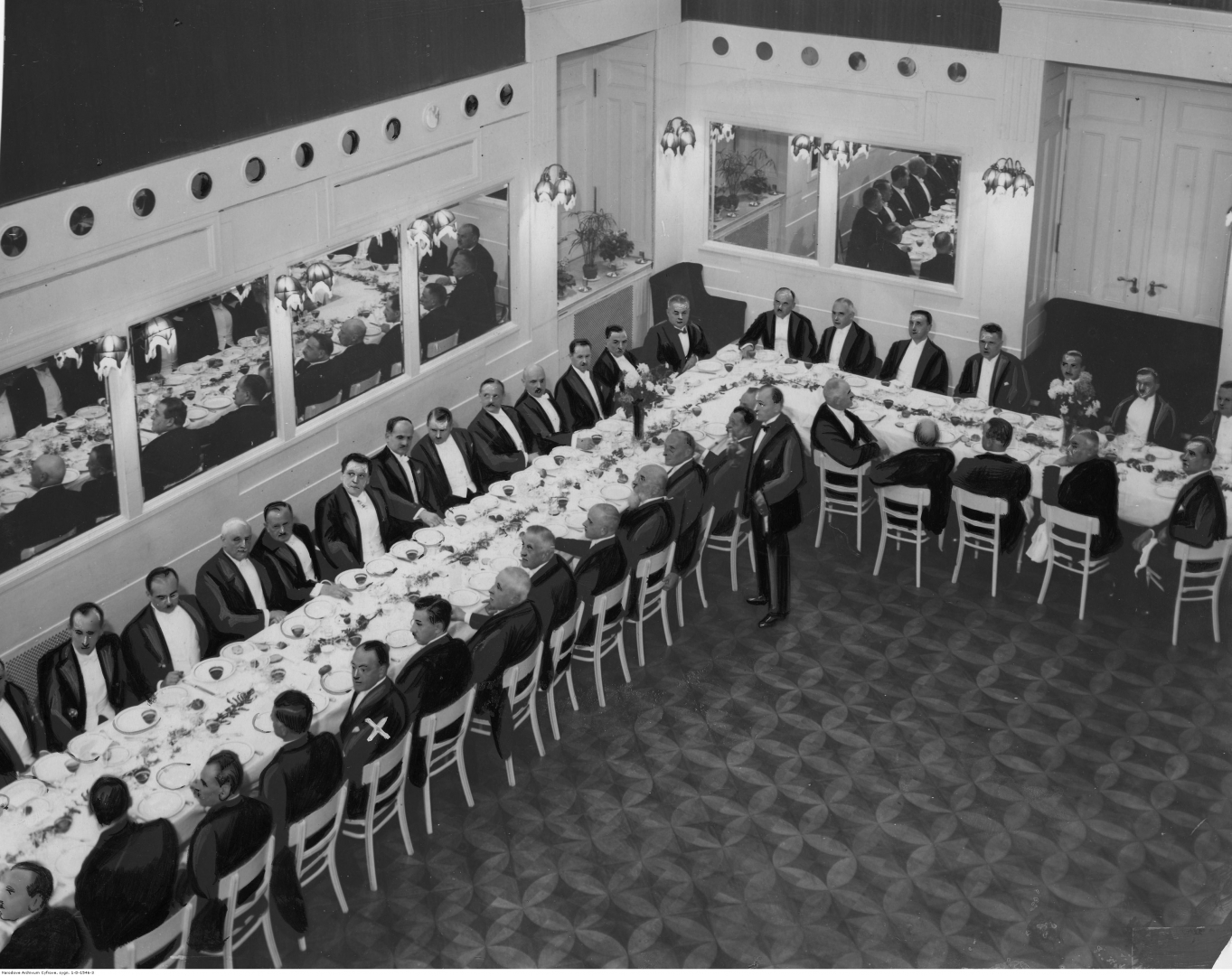 Widoczni m.in.: Charles Dewey (piąty z lewej tyłem), minister przemysłu i handlu Eugeniusz Kwiatkowski (szósty z lewej - tyłem), minister robót publicznych Maksymilian Matakiewicz (siódmy z lewej - tyłem), minister reform rolnych Witold Staniewicz (pierwszy z lewej - przodem), minister spraw zagranicznych Józef Beck (drugi z lewej - przodem), minister skarbu Ignacy Matuszewski, minister rolnictwa Leon Janta-Połczyński, minister poczt i telegrafów Ignacy Boerner, członek Rady Banku Polskiego Alfred Falter, prezes Banku Gospodarstwa Krajowego Roman Górecki oraz wiceminister skarbu Stefan Starzyński.