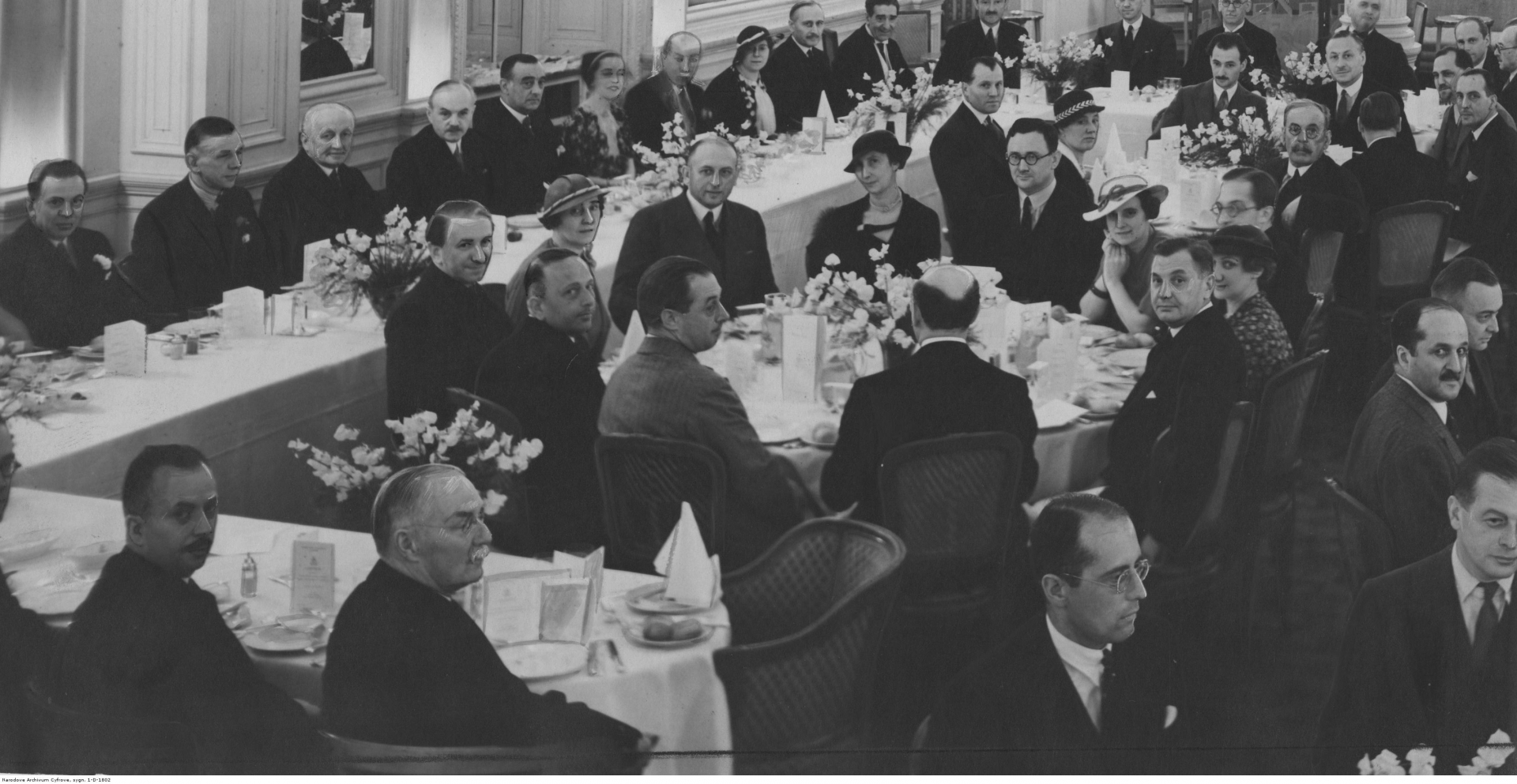 Przy długim stole siedzą m.in.: podsekretarz stanu w Foreign Office Sir Robert Vansittart (1. z lewej), wiceprezes Związku Prasy Zagranicznej Eric Swenne ze Szwecji (2. z lewej), ambasador Konstanty Skirmunt (3. z lewej), prezes Związku Prasy Zagranicznej Jean Massip z Francji (4. z lewej), redaktor naczelny "Petit Parisien" Bois (10. z lewej), radca Ambasady RP w Wielkiej Brytanii Leon Orłowski (11. z lewej), szef sekcji informacyjno-prasowej Foreign Office Rex Leeper (12. z lewej), prezes Związku Prasy Angielskiej Peuman (13. z lewej).