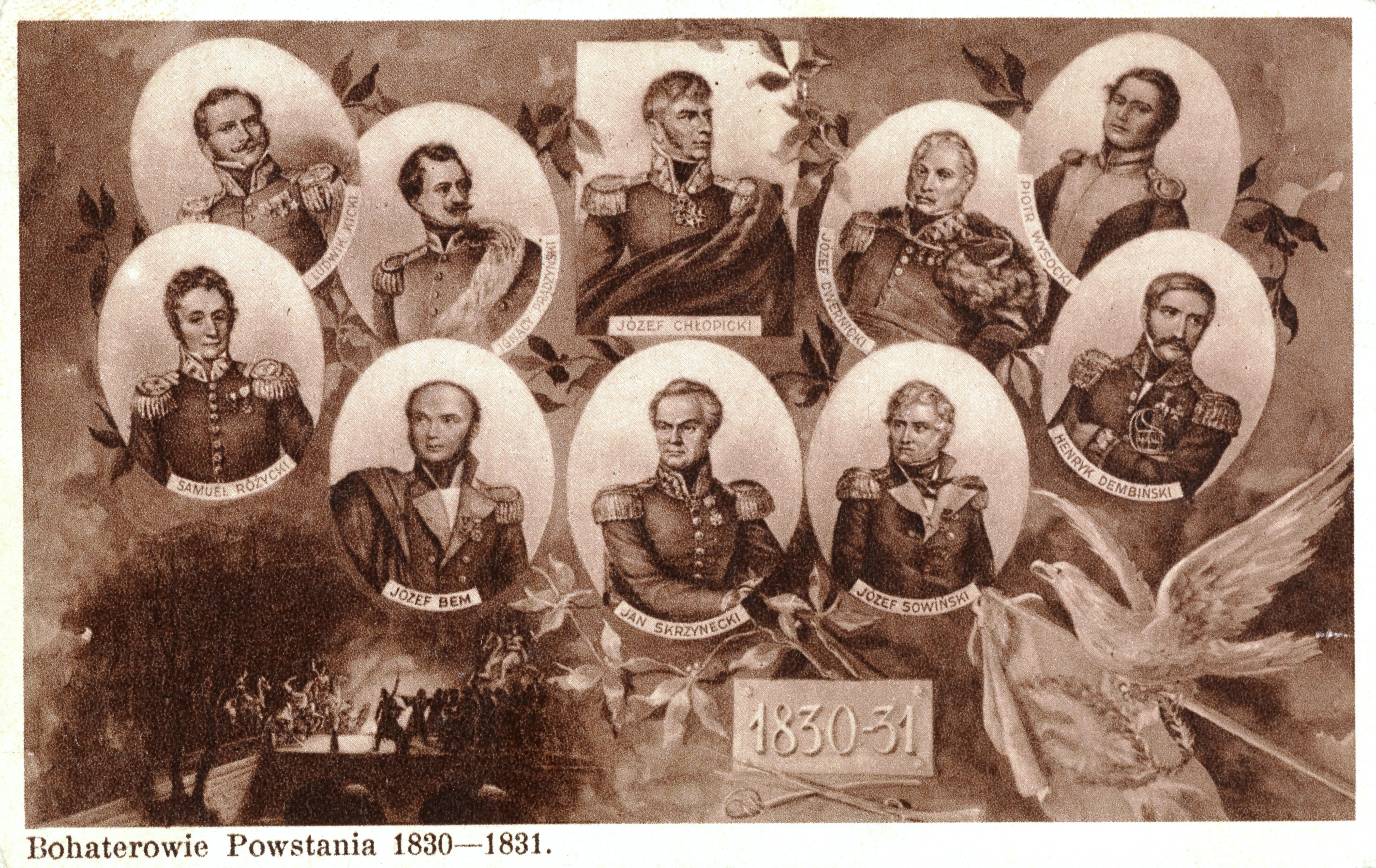 Dolny rząd, od lewej: Samuel Różycki, , Józef Bem, Jan Skrzynecki, Józef Sowiński i Henryk Dembiński.