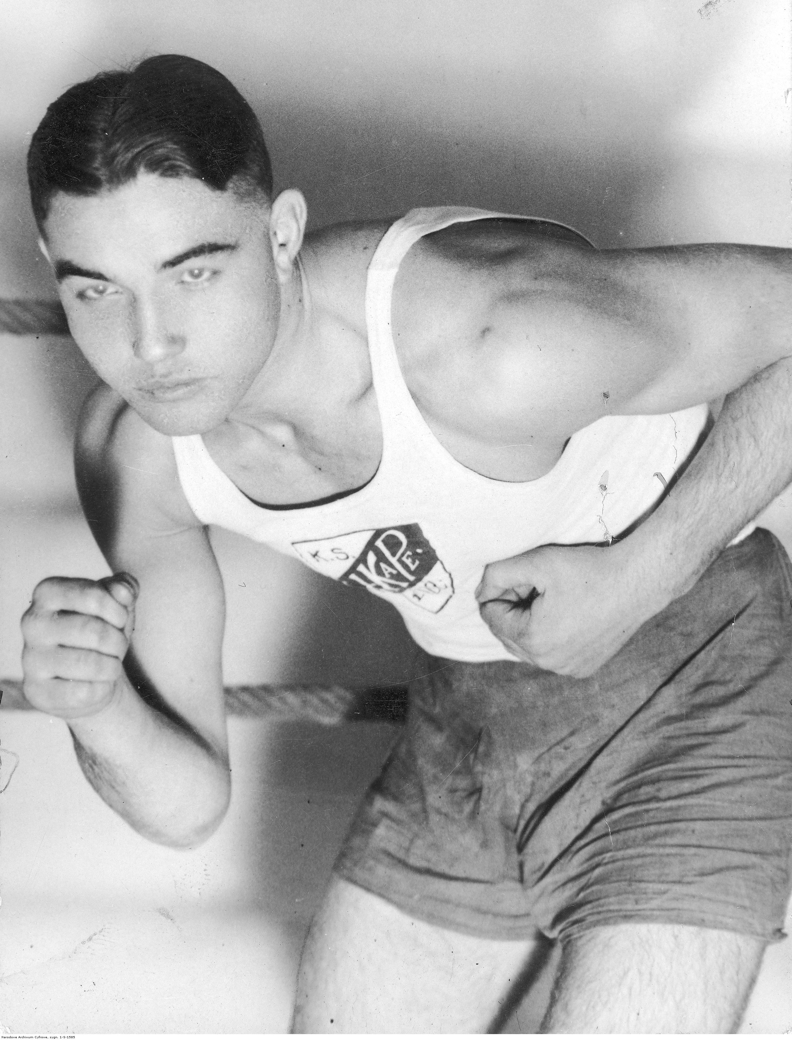, Bokser Henryk Chmielewski w stroju gimnastycznym w pozie bokserskiej., [w:] Polski słownik biograficzny, t. ,