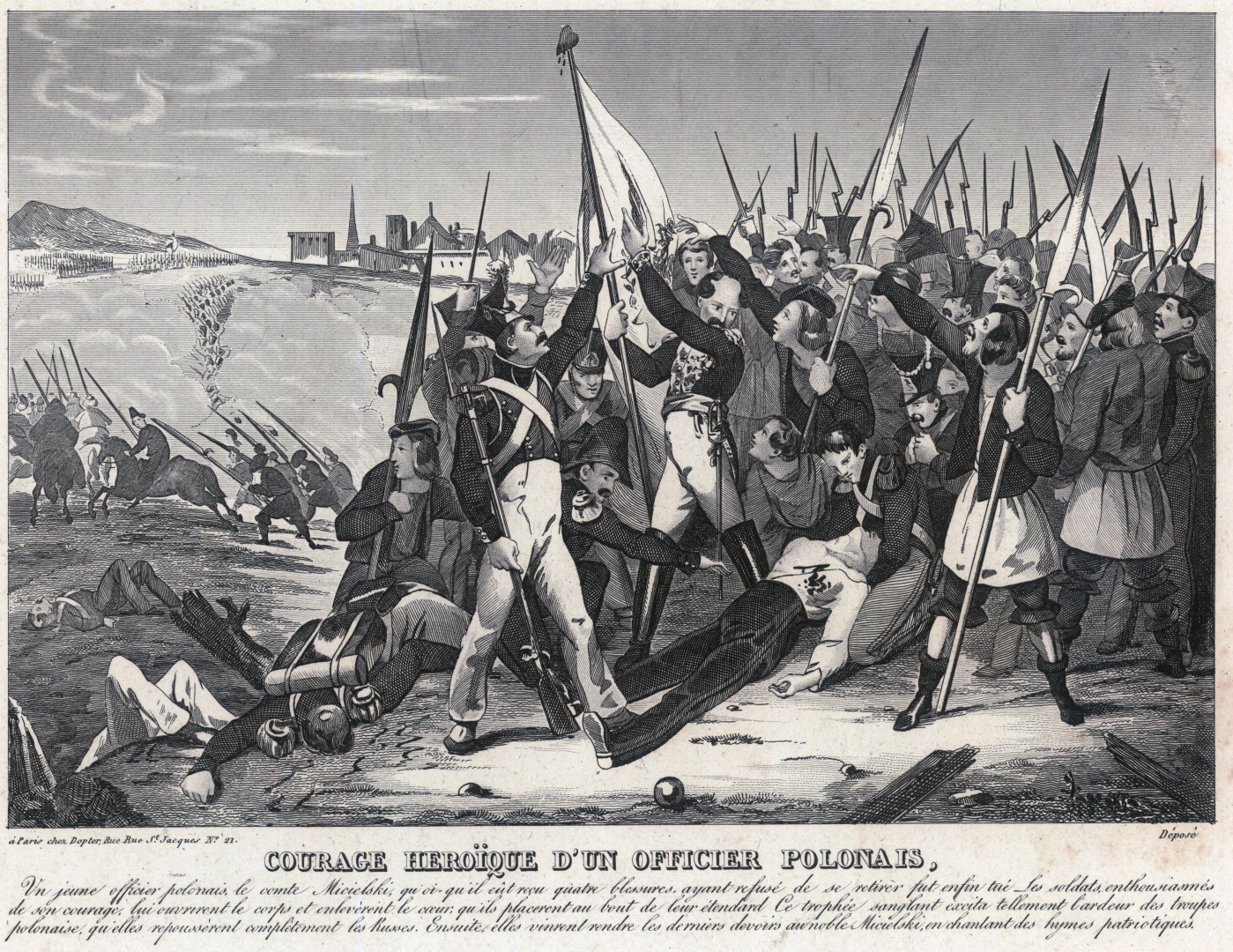 Podpis pod ilustracją (w jęz. francuskim) brzmi: "Heroiczna odwaga polskiego oficera: młody oficer polski książę Micielski, po otrzymaniu czterech ran, odmówił wycofania się i został w końcu zabity. Żołnierze poruszeni jego odwagą, otworzyli jego ciało i wyjęli serce, które umieścili na szczycie swego sztandaru. To krwawe trofeum tak rozpaliło żar wojsk polskich, że odparły one całkowicie Rosjan. Potem żołnierze przyszli oddać ostatni hołd szalchetnemu Micielskiemu, śpiewając pieśni patriotyczne."