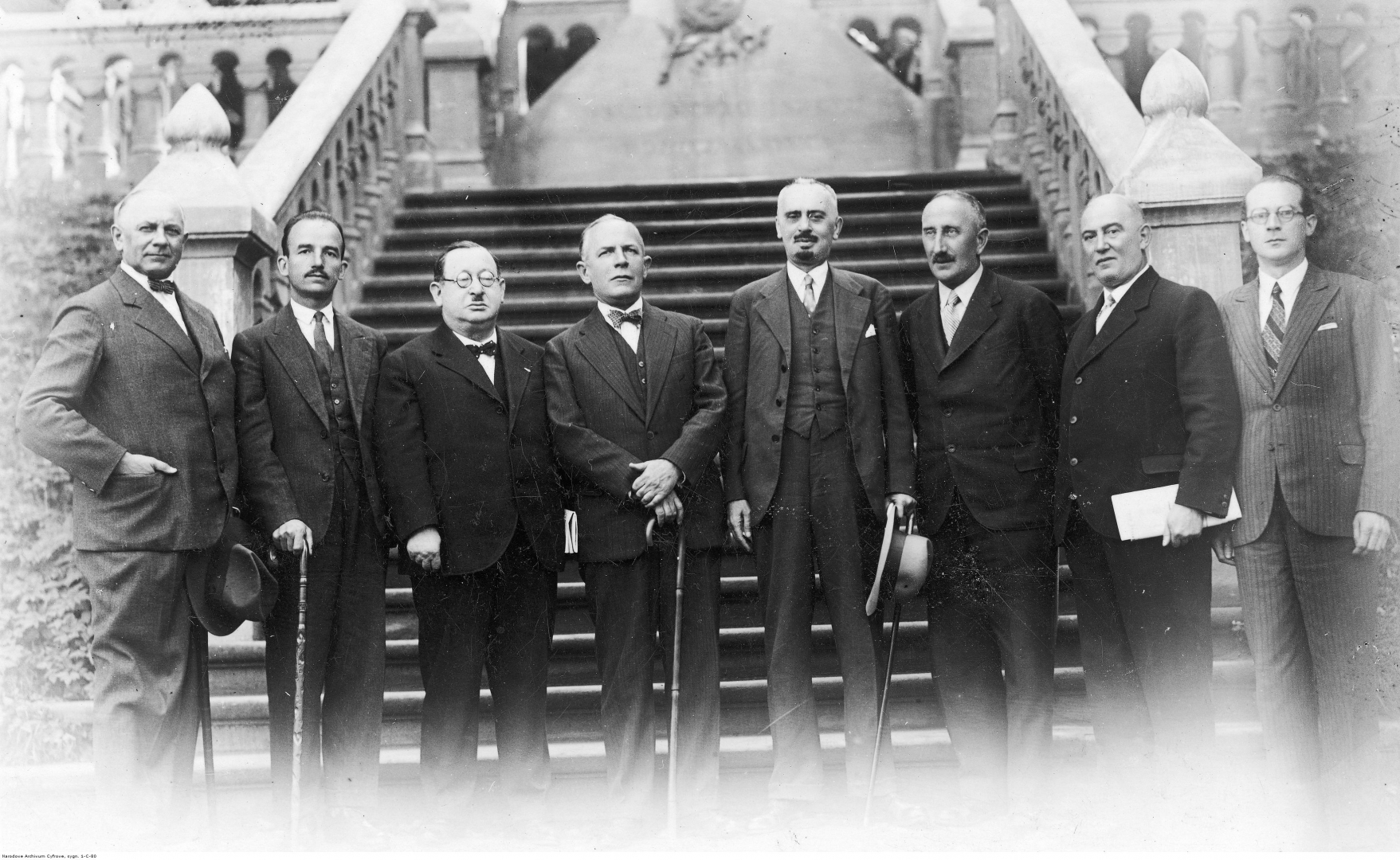 Stoją od lewej do prawej: dr Kazimierz Wilczewski, dr Wacław Graba-Łęcki, NN, dr Stanisław Lewicki, prezes Stowarzyszenia Lekarzy Polskich dr Ludwik Korybut-Daszkiewicz, NN, inż. Leon Nowotarski, dr Gustaw Praetzel, dr Mikołaj Bernstein.
