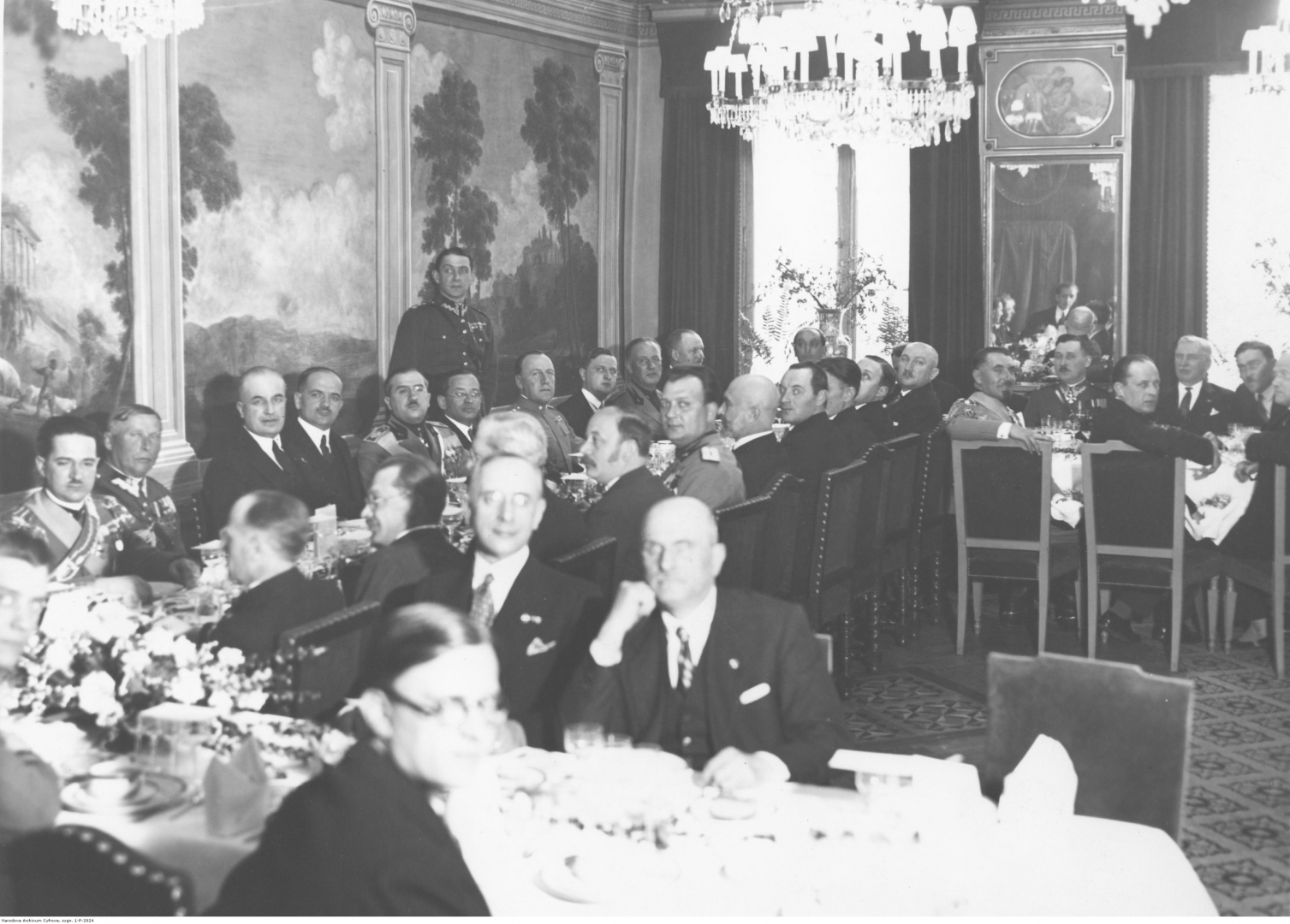 Bankiet wydany na cześć gości. Przy głównym stole od strony ściany widoczni m.in.: poseł gen. Andrzej Galica (2. z lewej), ambasador Włoch w Polsce Luigi Vannutelli-Rey (3. z lewej), prezes Federacji Polskich Związków Obrońców Ojczyzny gen. Roman Górecki (4. z lewej), przewodniczący delegacji Eugenio Coselschi (5. z lewej), dyrektor Biura Sejmu RP Władysław Dziadosz (6. z lewej), od strony sali: wicemarszałek sejmu Karol Polakiewicz (4. z lewej), prezes BBWR Walery Sławek (6. z lewej), poseł Władysław Starzak (7. z lewej), wicekomisarz Rządu na m.st. Warszawę Józef Ołpiński (10. z lewej).