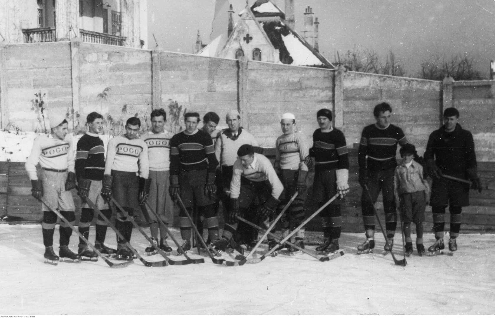Członkowie drużyny podczas treningu na lodowisku. Widoczni: Ehrbar, Krasuski, Grancz, Kazimierz Sokołowski, Jan Hemmerling, Kunach, Kupczyński, Czesław Bereza, Roman Sabiński, Wacław Kuchar, Stworzeński, Karol Weissberg.