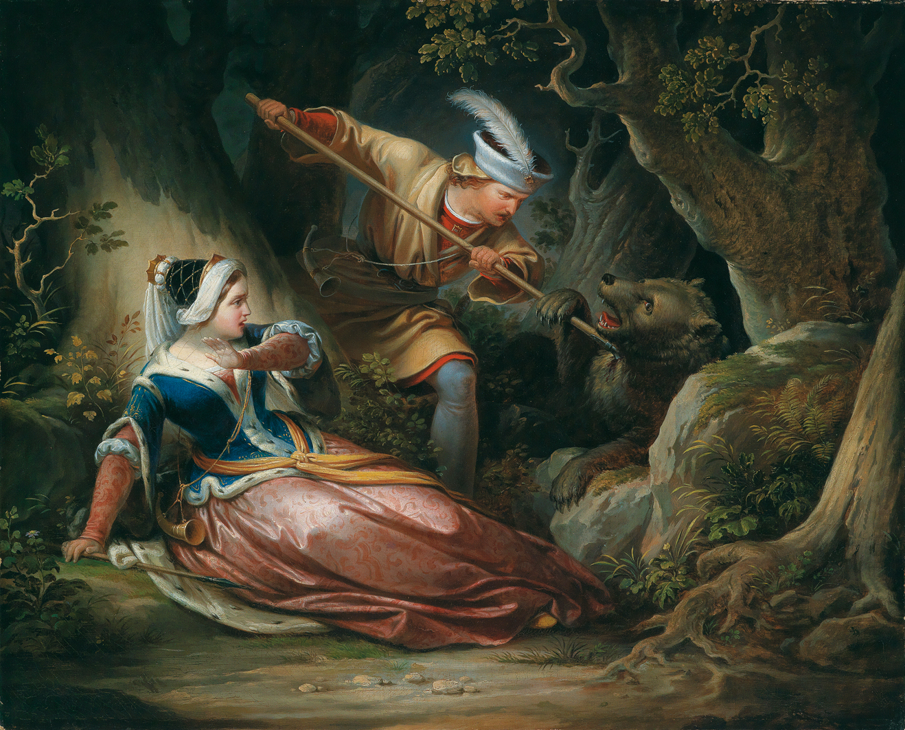 Obraz olejny z 1856 roku.  Obraz ten odnosi się do legendy o tym, jak książę  austriacki Ernest spotkał swoją przyszłą żonę Cymbarkę, ratując jej życie na polowaniu.