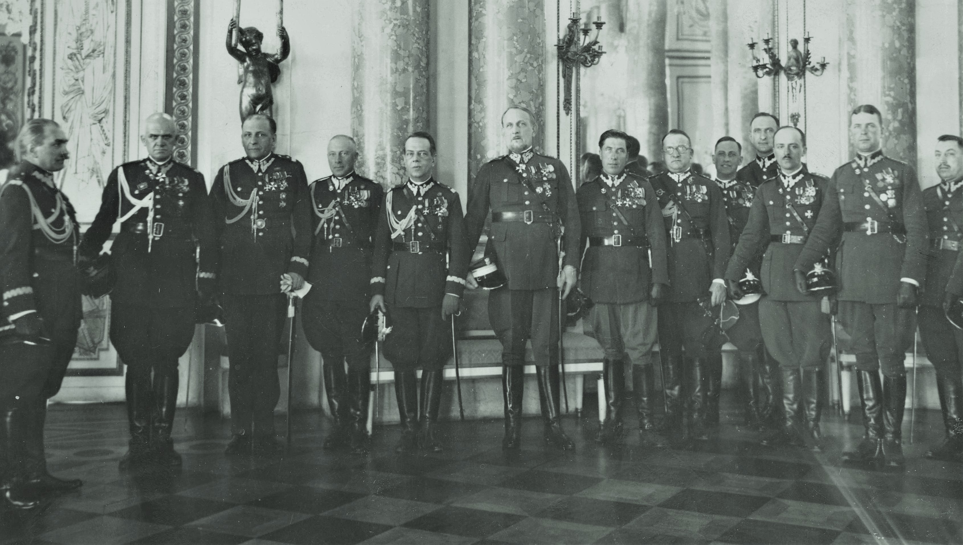 Wiceminister spraw wojskowych gen. bryg. Felicjan Sławoj Składkowski (z lewej), w imieniu prezydenta Ignacego Mościckiego, dekoruje krzyżami zasługi działaczy wojskowych L.O.P.P. Od lewej generałowie: Stanisław Rouppert, Stanisław Kwaśniewski, Władysław Bończa-Uzdowski, Janusz Gąsiorowski oraz płk Jan Jagrym Maleszewski, major Bogdan Kwieciński.
