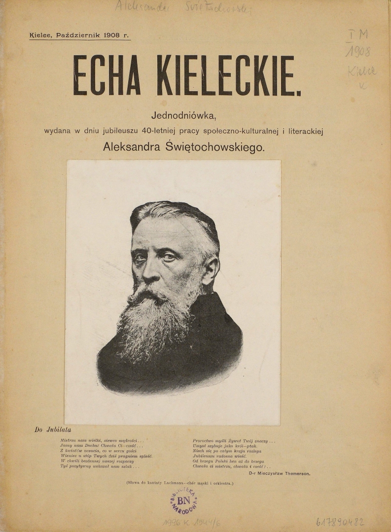 "Echa kieleckie : jednodniówka wydana w dniu jubileuszu 40-letniej pracy społeczno-kulturalnej i literackiej Aleksandra Świętochowskiego"., [online] Warszawa: Narodowy Instytut Audiowizualny [dostęp 27.02.2026]. Dostępny w internecie: http://www.biogramy.pl/a/foto/echa-kieleckie-jednodniowka-wydana-w-dniu-jubileuszu-40-letniej-pracy-spoleczno-kulturalnej-i-literackiej-aleksandra-swietochowskiego