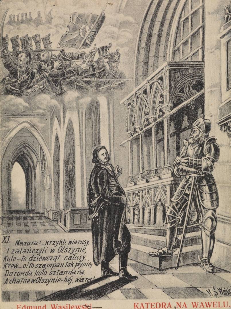 Pocztówka, datowana na rok 1907 (?), wykorzystuje malarstwo Kajetana Saryusza-Wolskiego i fragment poematu "Katedra na Wawelu" Edmunda Wasilewskiego (jest to jedna z cyklu pocztówek ilustrujących różne fragmenty tego poematu).