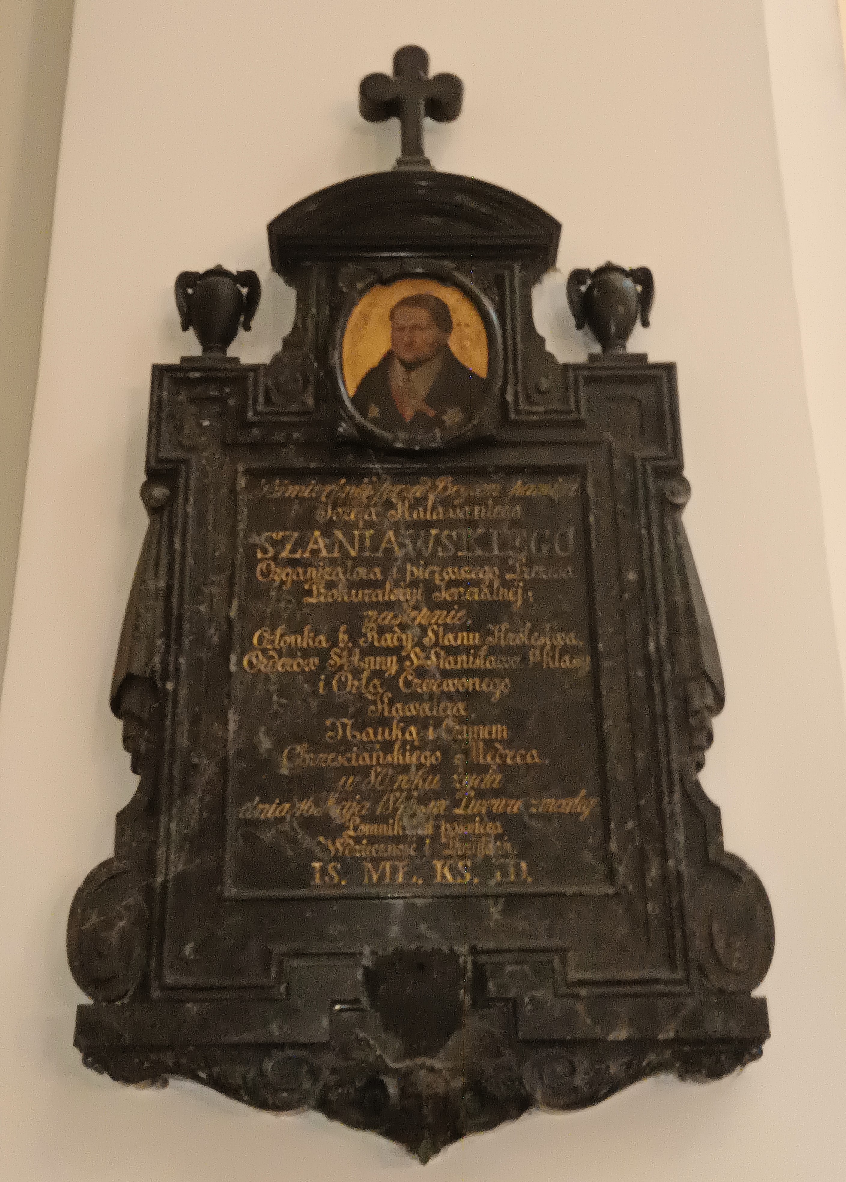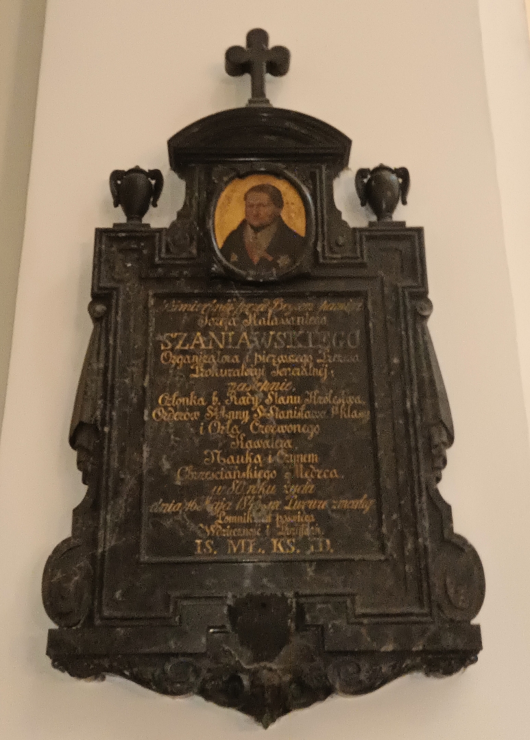 Napis na tablicy głosi: "Pośmiertnej przed Bogiem pamięci, Józefa Kalassantego SZANIAWSKIEGO Organizatora i pierwszego Prezesa Prokuratoryji Jeneralnej; następnie, Członka b. Rady Stanu Królestwa. Orderów Św Anny Św Stanisława 1 klasy i Orła Czerwonego Kawalera. Nauką i Czynem, Chrześcijańskiego Mędrca, w 80 roku życia dnia 16 maja 1843 we Lwowie zmarłego Pomnik ten poświęca. Wdzięczność i Przyjaźń. IS. MŁ. KS. ID."