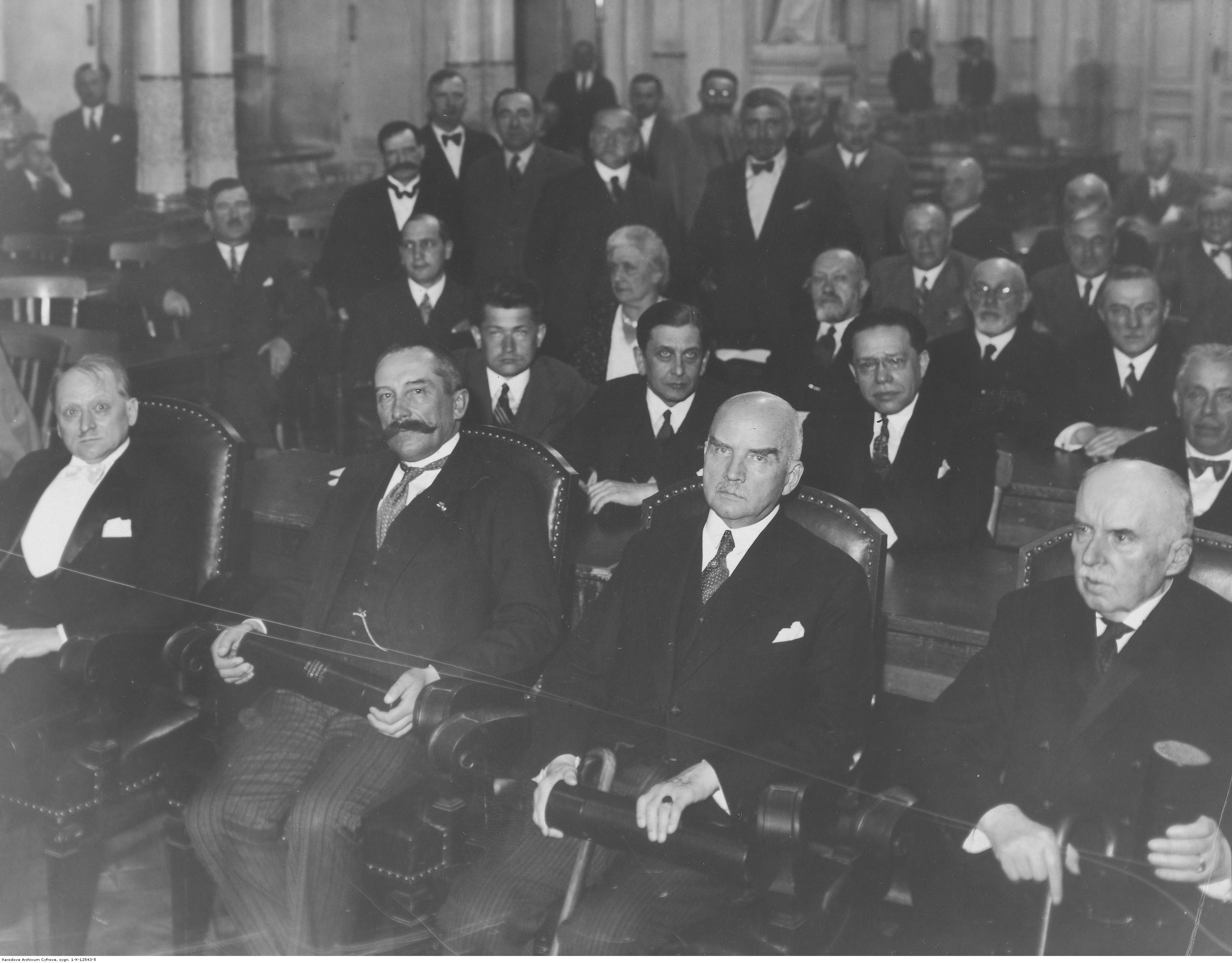 Laureaci nagród na widowni. W pierwszym rzędzie siedzą od lewej: rzeźbiarz Xawery Dunikowski (nagroda artystyczna), prof. Emil Godlewski (nagroda naukowa), kompozytor Emil Młynarski (nagroda muzyczna), pisarz Józef Weyssenhoff (nagroda literacka).