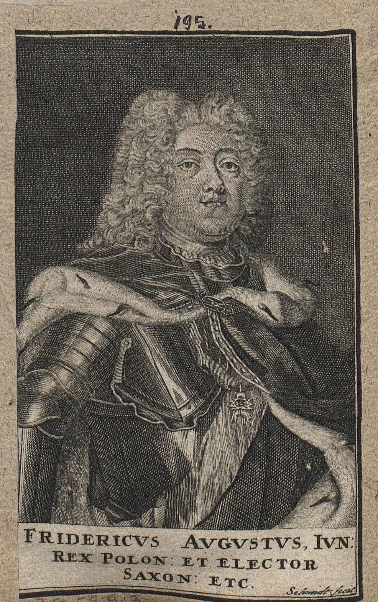 Grafika przedstawiająca "Fryderyka Augusta Młodszego Króla Polski i Elektora Saskiego etc.", czyli króla Polski, Augusta III.