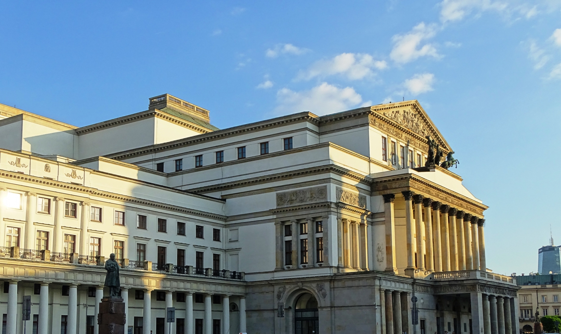 Monumentalny klasycystyczny gmach zaprojektowany został przez Antonia Corazziego. Budynek wzorowany był na teatrze Carlo Nicoliniego w Neapolu. Kamień węgielny położono w listopadzie 1825 roku, w 150 rocznicę utworzenia Teatru Narodowego. W uroczystości wzięli udział m.in. namiestnik Królestwa Polskiego Józef Zajączek i minister skarbu Franciszek Ksawery Drucki-Lubecki. Gmach składał się z korpusu głównego mieszczącego salę teatralną oraz dwóch skrzydeł bocznych. .Po powstaniu listopadowym zmieniono pierwotny projekt Corazziego na bardziej oszczędny, zmniejszając liczbę miejsc dla widzów i likwidując wielką lożę królewską na wprost sceny.