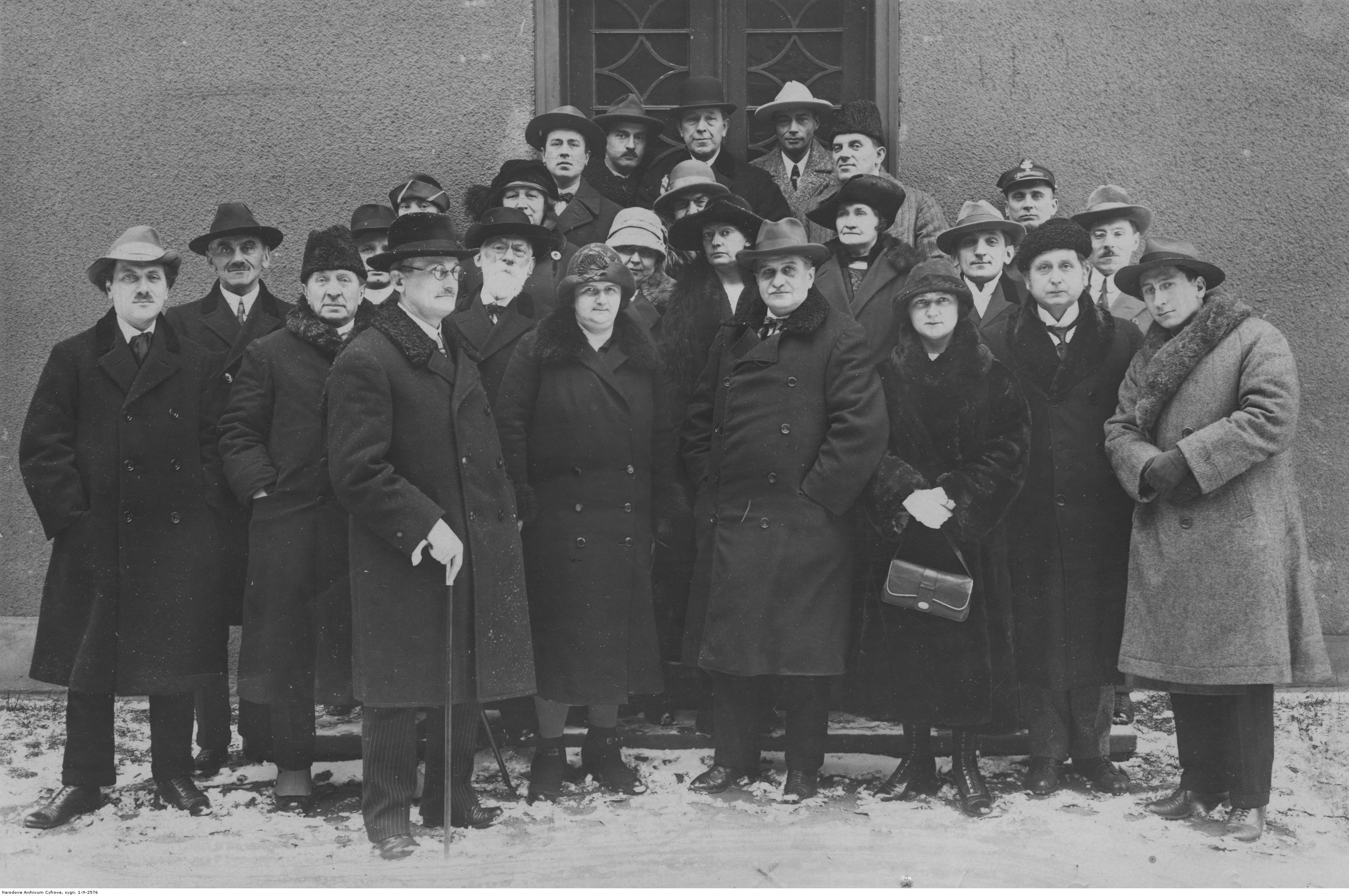 Fotografia grupowa nauczycieli w dniu 5-lecia szkoły. Widoczni w pierwszym rzędzie: dyrektor konserwatorium Henryk Opieński (4. z prawej), pianistka Gertruda Konatkowska (3. z prawej), kompozytor Feliks Nowowiejski (2. z prawej), dyrygent chórów m.in. "Echo" W. Raczkowski (1. z prawej).
