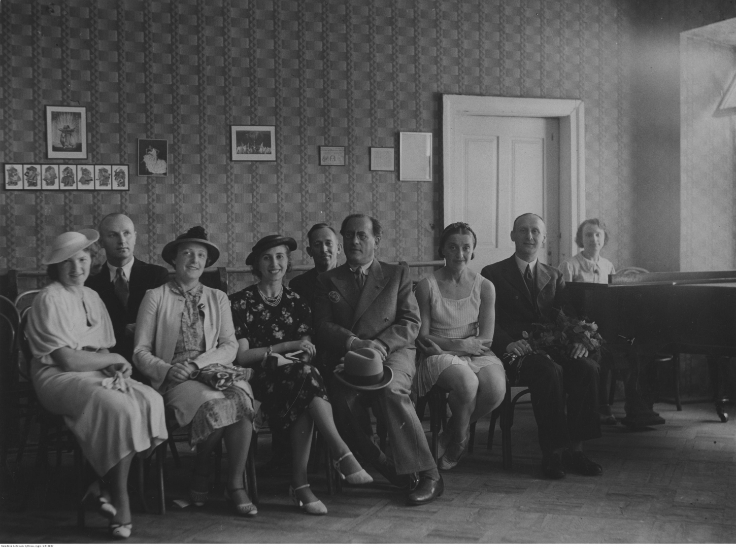Siedzą od lewej: delegatka Zarządu Miasta Zofia Szulcowa, baletmistrz Jan Ciepliński, primabalerina Opery Warszawskiej Halina Szmolcówna, kierowniczka szkoły tańca artystycznego Irena Prusicka, tancerz Zygmunt Szubiakiewicz, kapelmistrz Grzegorz Fitelberg, tancerka Halina Hulanicka, prof. Zygmunt Dąbrowski i pianistka M. Jastrzębska.