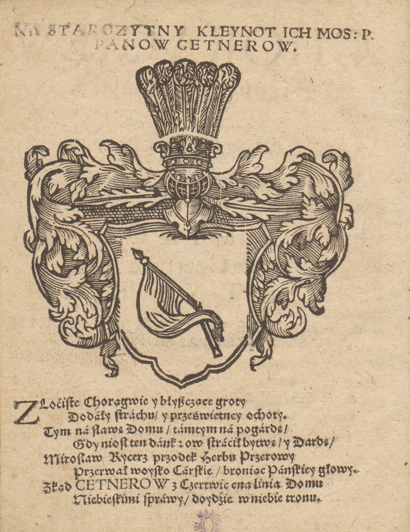 Herb Panów Cetnerów w druku panegirycznym autorstwa Szymona Okolskiego "Chorągiew tryumphalna troiaka, szlachecka, chrzescianska, swieta na pogrzebie [...] Mikołaia z Czertwic Cetnera w kosciele podkamienieckim Naswietszey Panny Rozanca S.", wydanej u Jezuitów we Lwowie w roku 1644.