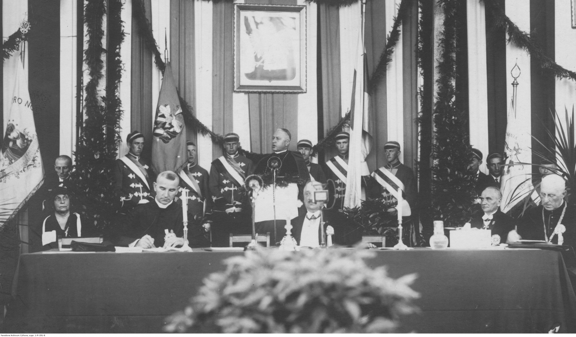 Członkowie prezydium podczas przemówienia prymasa Polski ks. kard. Augusta Hlonda (widoczny w głębi). Przy stole siedzą m.in.: hrabina Zamojska (pierwsza z lewej), marszałek kongresu hrabia Adolf Bniński (w środku), prof. Paweł Gantkowski (drugi z prawej), ks. prałat Józef Prądzyński (pierwszy z prawej).