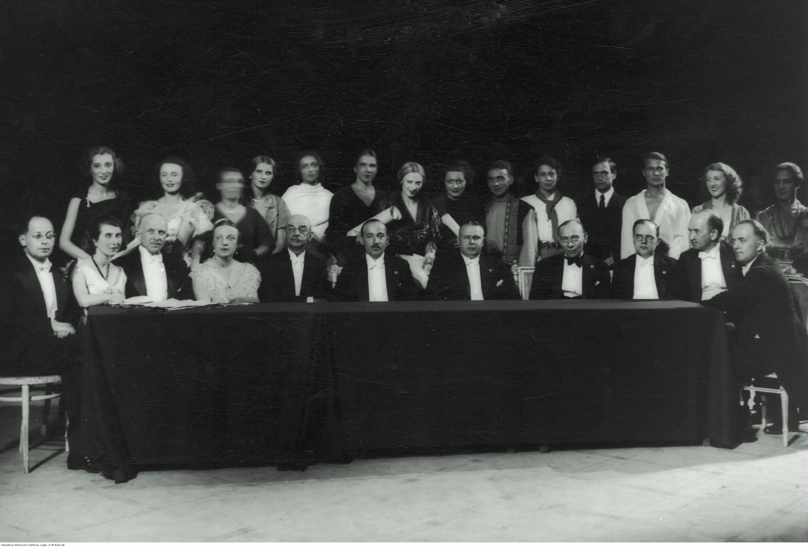 Rozdanie nagród w Teatrze Wielkiem - członkowie komitetu konkursowego, fundatorzy nagród i tancerze. Siedzą w pierwszym rzędzie (od 2. osoby lewej): tancerka Irena Prusicka, prezes Karol Bertoni, tancerka Halina Szmolcówna, prezes Towarzystwa Zachęty Sztuk Pięknych Stanisław Brzeziński, dyrektor Departementu Konsularnego MSZ Wacław Jędrzejewicz, szef Kancelarii Cywilnej Prezydenta RP Bronisław Hełczyński, wiceprezydent Warszawy Marian Borzęcki, naczelnik Wydziału Sztuki w Min. WRiOP Władysław Zawistowski, prof. Głowacki, red. "Muzyki" Mateusz Gliński.