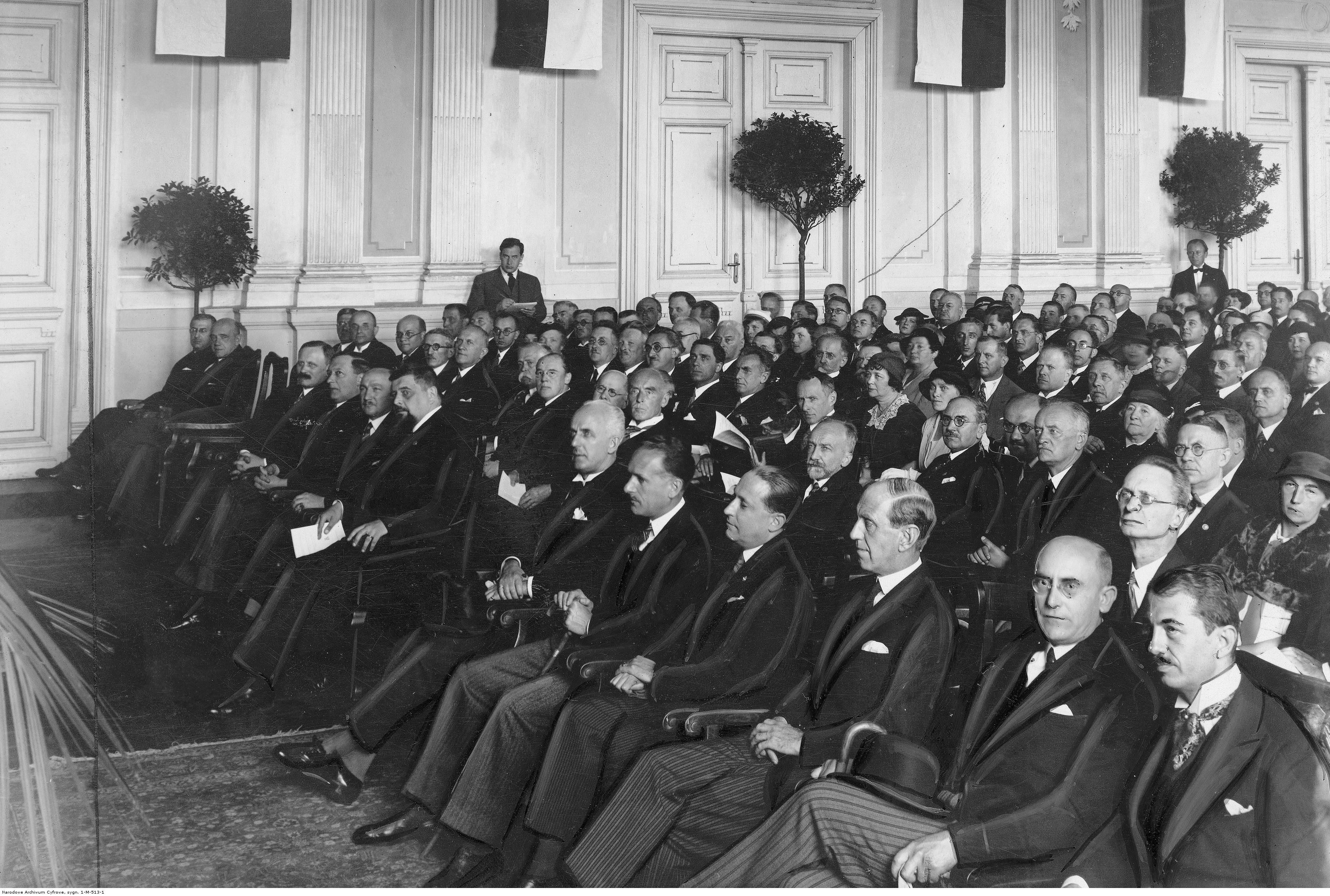 Uroczystość otwarcia zjazdu w auli Politechniki Warszawskiej. Widoczny m.in.: wiceminister wyznań religijnych i oświecenia publicznego Konstanty Chyliński (siedzi 6. z lewej w pierwszym rzędzie), prof. Stanisław Kot (5. z lewej w trzecim rzędzie), prof. Ettore Lo Gatto (7. z lewej w trzecim rzędzie, w okularach), prof. Enrico Damiani (8. z lewej w trzecim rzędzie), prof. Giovanni Maver (9. z lewej w trzecim rzędzie), prof. Roman Pollak (10. z lewej w trzecim rzędzie).