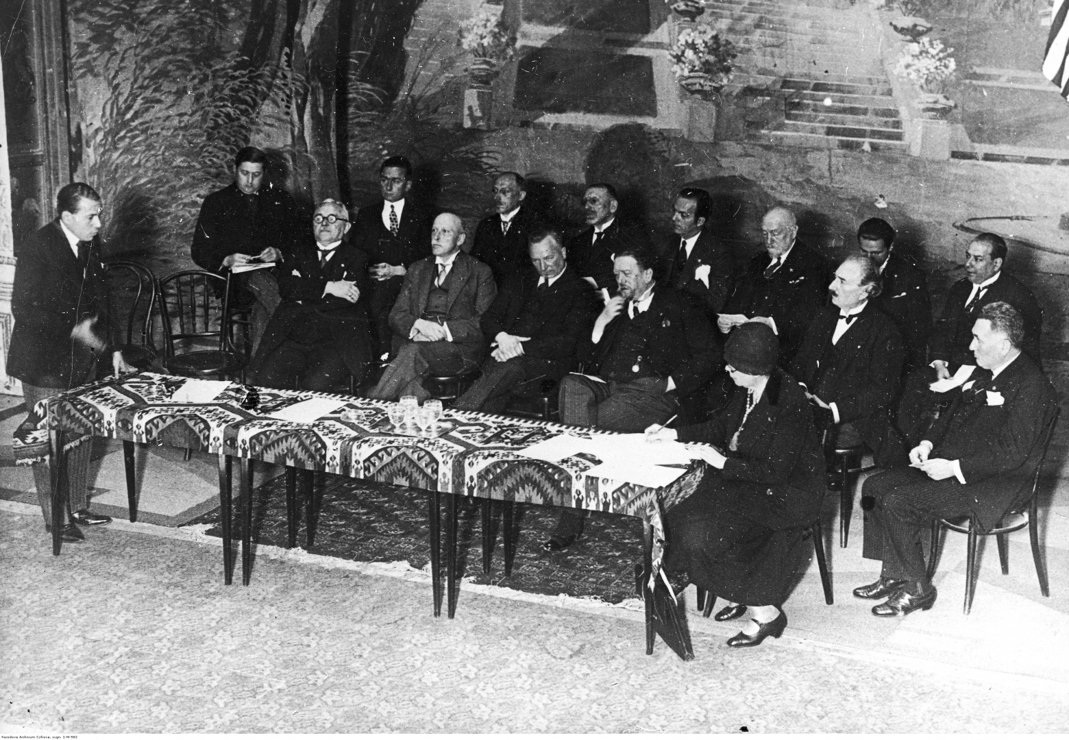 Wśród uczestników kongresu widoczni są m.in.: pisarz amerykański Irwing Schwerke (1. z lewej), niemiecki krytyk muzyczny Hermann Springer (3. z lewej), krytyk literacki z Francji Fortunat Strowski (6. z lewej), kompozytor rumuński Stan Golestan (8. z lewej), prozaik Emil D. Fagure (9. z lewej), pisarz portugalski Antonio Ferro (10. z lewej), poeta polski Cezary Jellenka (11. z lewej), duński krytyk muzyczny Gustav Hetsch (12. z lewej), delegat czechosłowacki Jan Bartos (13. z lewej).