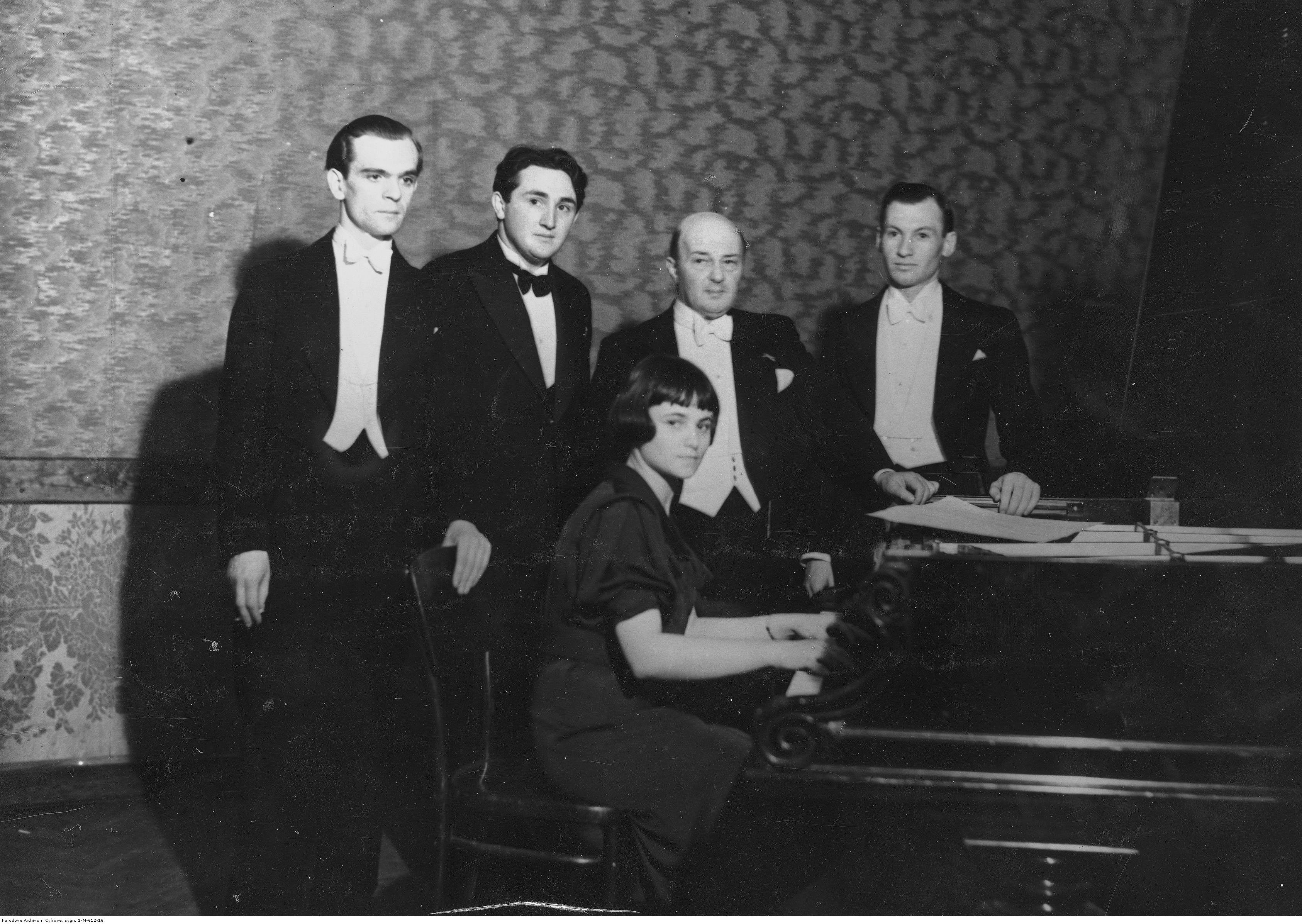 Laureaci konkursu i przewodniczący jury za kulisami. Widoczni od lewej: laureat III nagrody Witold Małcużyński, laureat I nagrody Jakow Zak, laureatka II nagrody Roza Tamarkina (przy fortepianie), przewodniczący jury Adam Wieniawski, laureat IV nagrody Lance Dossor.
