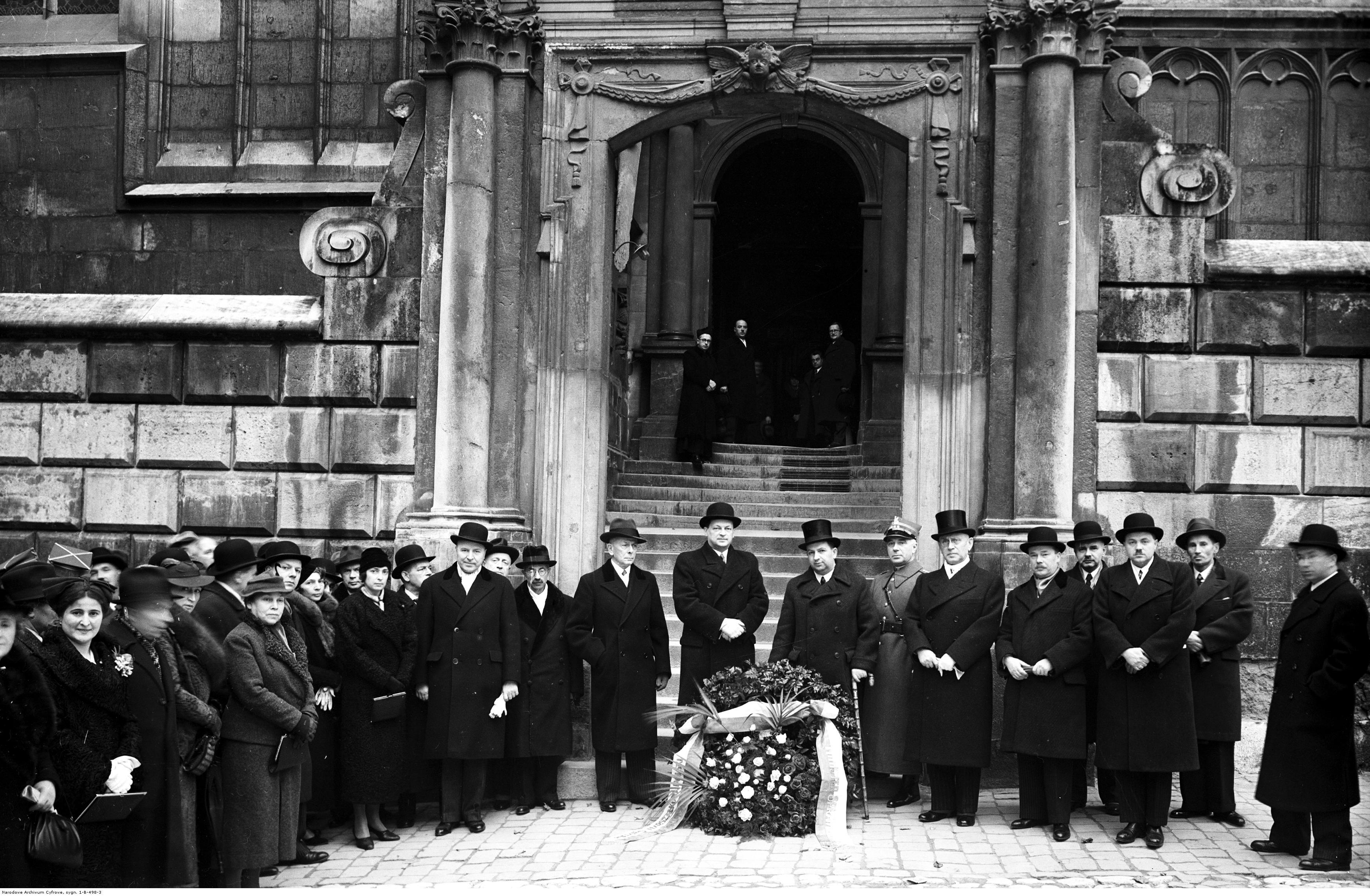 Uczestnicy zjazdu z wieńcem przed katedrą wawelską. Widoczni m.in.: wicewojewoda krakowski Piotr Małaszyński (8. z prawej), minister sprawiedliwości Witold Grabowski (5. z lewej), marszałek sejmu Stanisław Car (13. z prawej), prezes Sądu Najwyższego Leon Supiński (10. z prawej), prezydent Krakowa Mieczysław Kaplicki (6. z prawej).