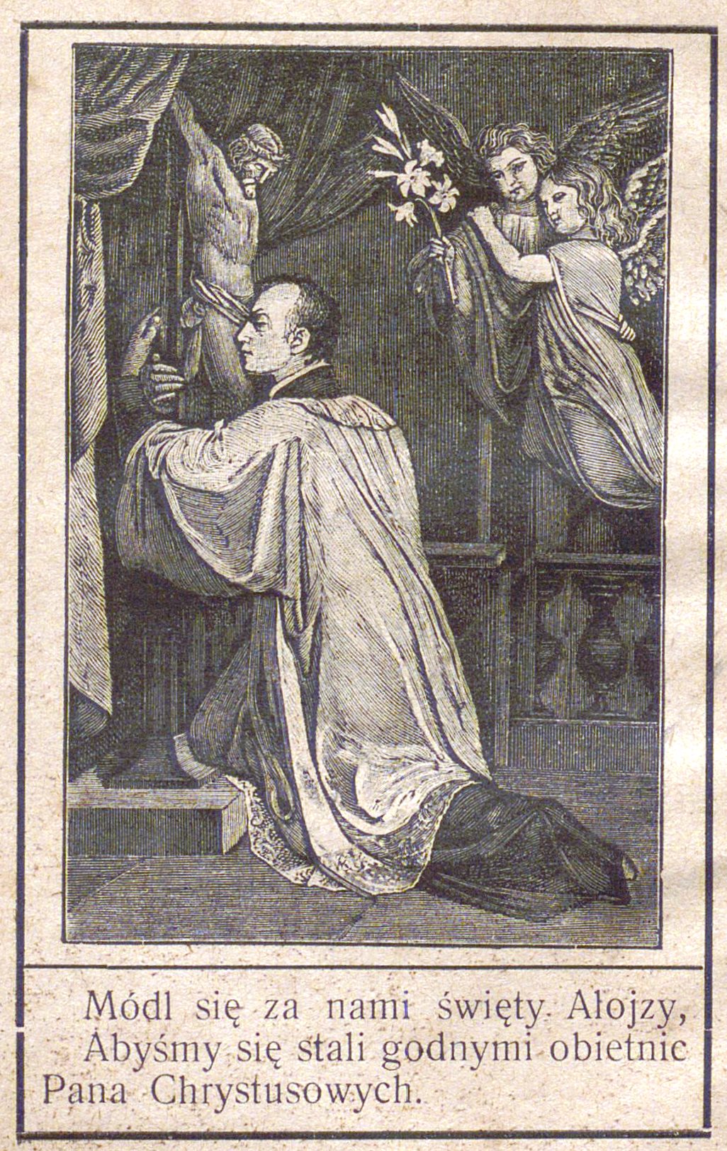 Ilustracja z książki Jana Chrząszcza "Kwiatek anielskiej czystości : książeczka św. młodzieniaszka Alojzego Gonzaga, Patrona młodzieży katolickiej, czyli Sześć Niedziel i dziewięciodniowa Nowenna na część świętego Alojzego"., [online] Warszawa: Narodowy Instytut Audiowizualny [dostęp 13.04.2026]. Dostępny w internecie: http://www.biogramy.pl/a/foto/ilustracja-z-ksiazki-jana-chrzaszcza-kwiatek-anielskiej-czystosci-ksiazeczka-sw-mlodzieniaszka-alojzego-gonzaga-patrona-mlodziezy-katolickiej-czyli-szesc-niedziel-i-dziewieciodniowa-nowenna-na-czesc-swietego-alojzego