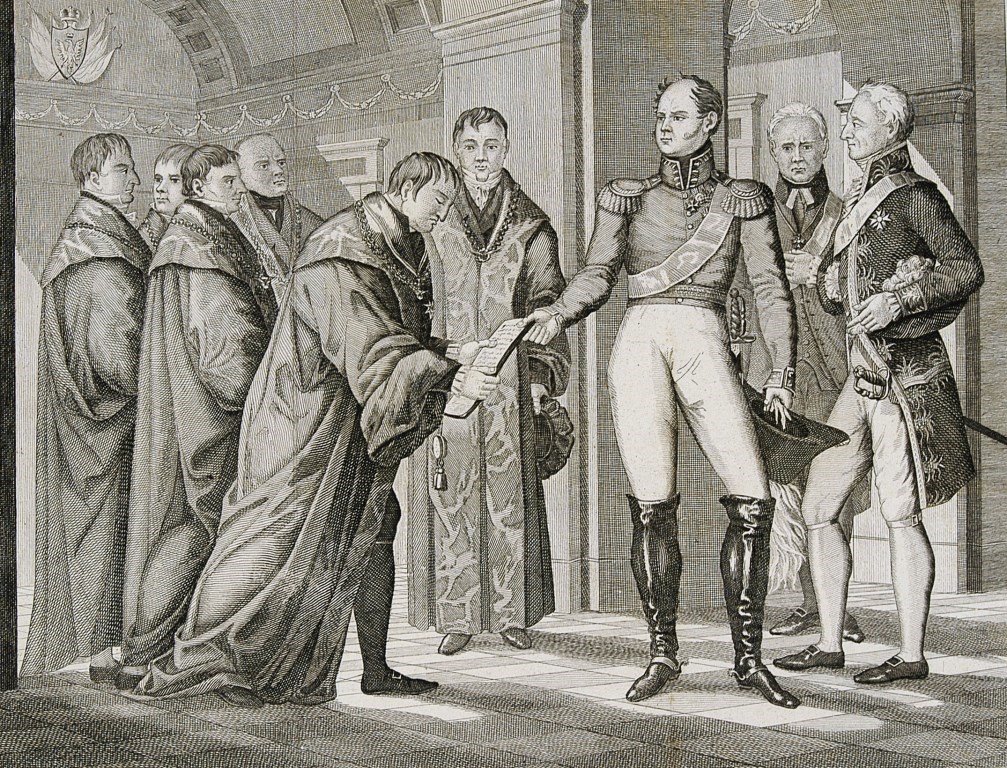 Na rycinie widoczni car Aleksander I, profesor Antoni Brodowski oraz Stanisław Staszic. Tytuł orgninalny ryciny "L'imperatore e re Alessandro I istituisce l'Università di Warsavia Copiato dal quadro del Professore Brodowski di Warsavia". Miedzioryt z 1831 r. Francesco S. Corsiego według wzoru Antonio Colberga. Rycina pochodzi z dzieła Bernarda Zaydlera "Storia della Polonia: fino agli ultimi tempi", wydanego we Florencji w 1831, t. 2, s. 618-619.