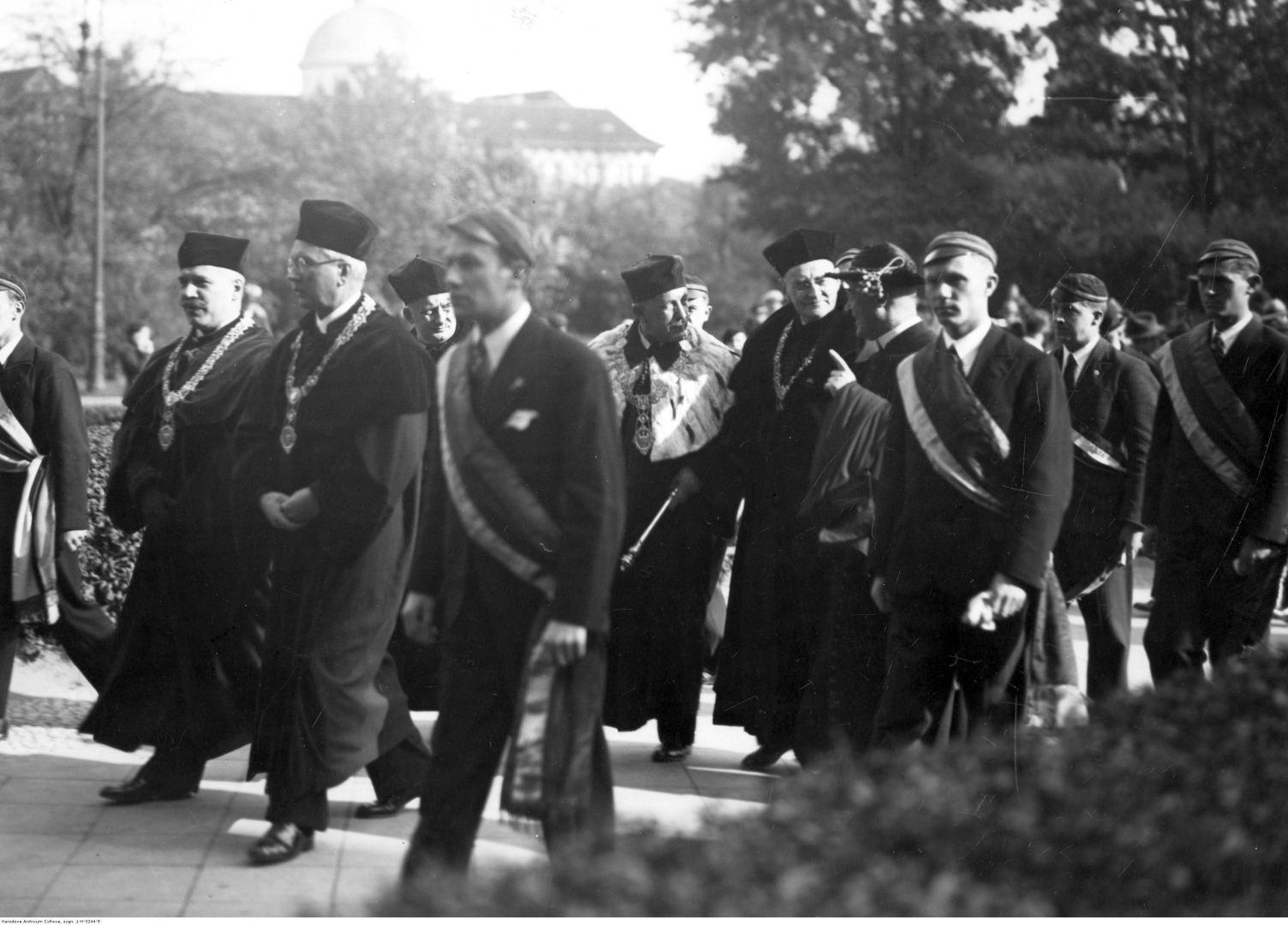 Senat akademicki i przedstawiciele korporacji studenckich po nabożeństwie w pochodzie z kaplicy zamkowej do auli uniwersyteckiej. Widoczni m.in. rektor Uniwersytetu Poznańskiego prof. Stanisław Runge (w pelerynie gronostajowej), duszpasterz uniwersytecki ks. Teodor Taczak (II rząd 2. z prawej), prorektor prof. Karol Joschner (II rząd z lewej), dr. Stanisław Kasznica (II rząd 3. z prawej), prof. Stefan Błachowski (I rząd 2. z prawej), prof. Tadeusz Kurkiewicz (I rząd 3. z prawej).