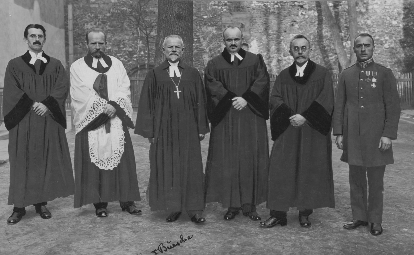 Fotografia grupowa uczestników uroczystości. Widoczni m.in.: ks. senior Karol Kulisz (2. z lewej), superintendent Kościoła ewangelicko - augsburskiego Juliusz Bursche (3. z lewej), profesor teologii praktycznej na Wydziale Teologii Ewangelickiej UW ks. prof. Karol Michejda (3. z prawej), ks. prof. Jan Stonawski (2. z prawej).