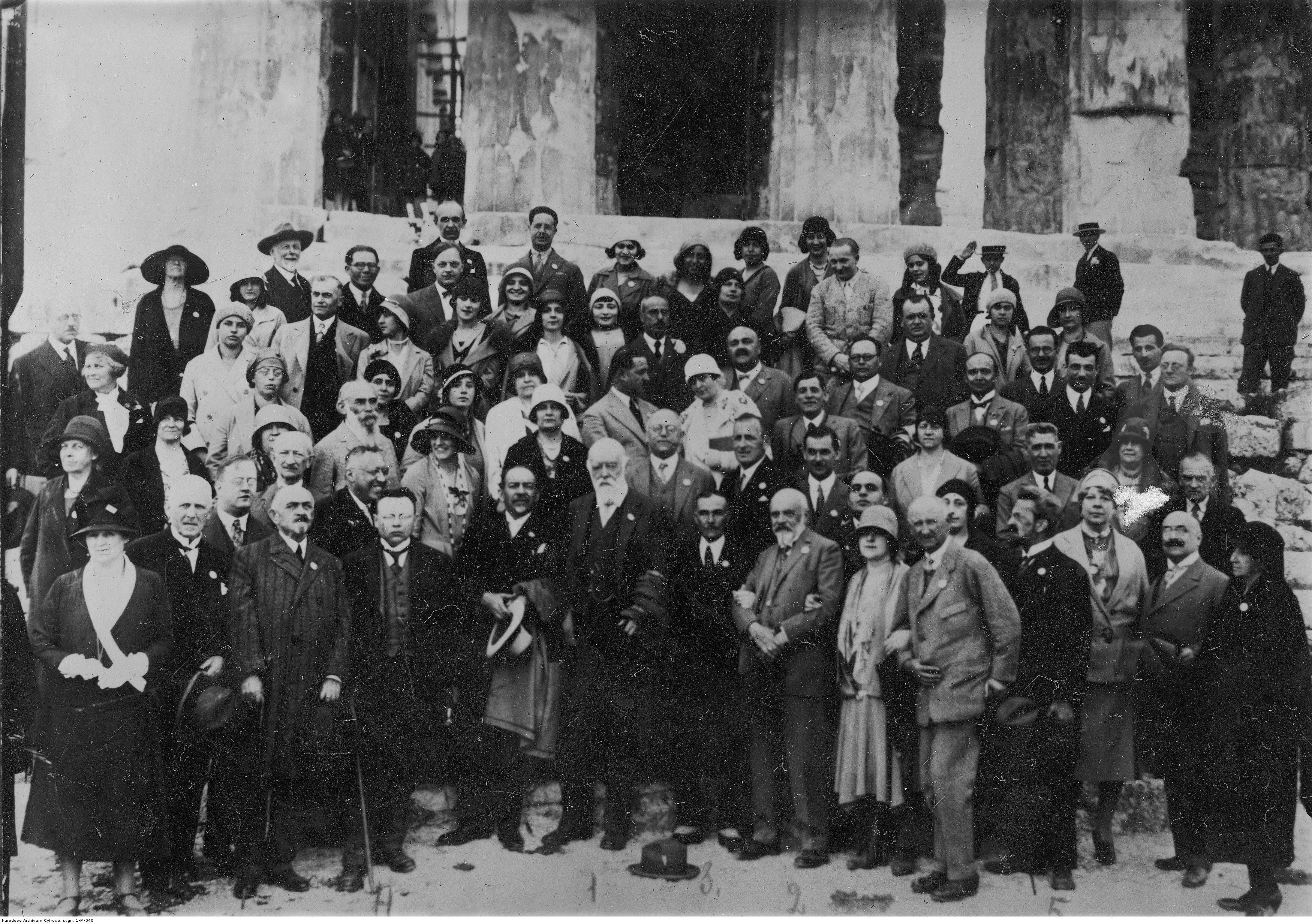 Grupa uczestników kongresu przed Partenonem na Akropolu. Widoczni m.in.: fizyk brytyjski Oliver Lodge (w środku), prezes kongresu Tanagras (8. z prawej), biolog i filozof niemiecki Hans Driesch (7. z prawej), prezes Warszawskiego Towarzystwa Badań Psychicznych Prosper Szmurło (4. z prawej).