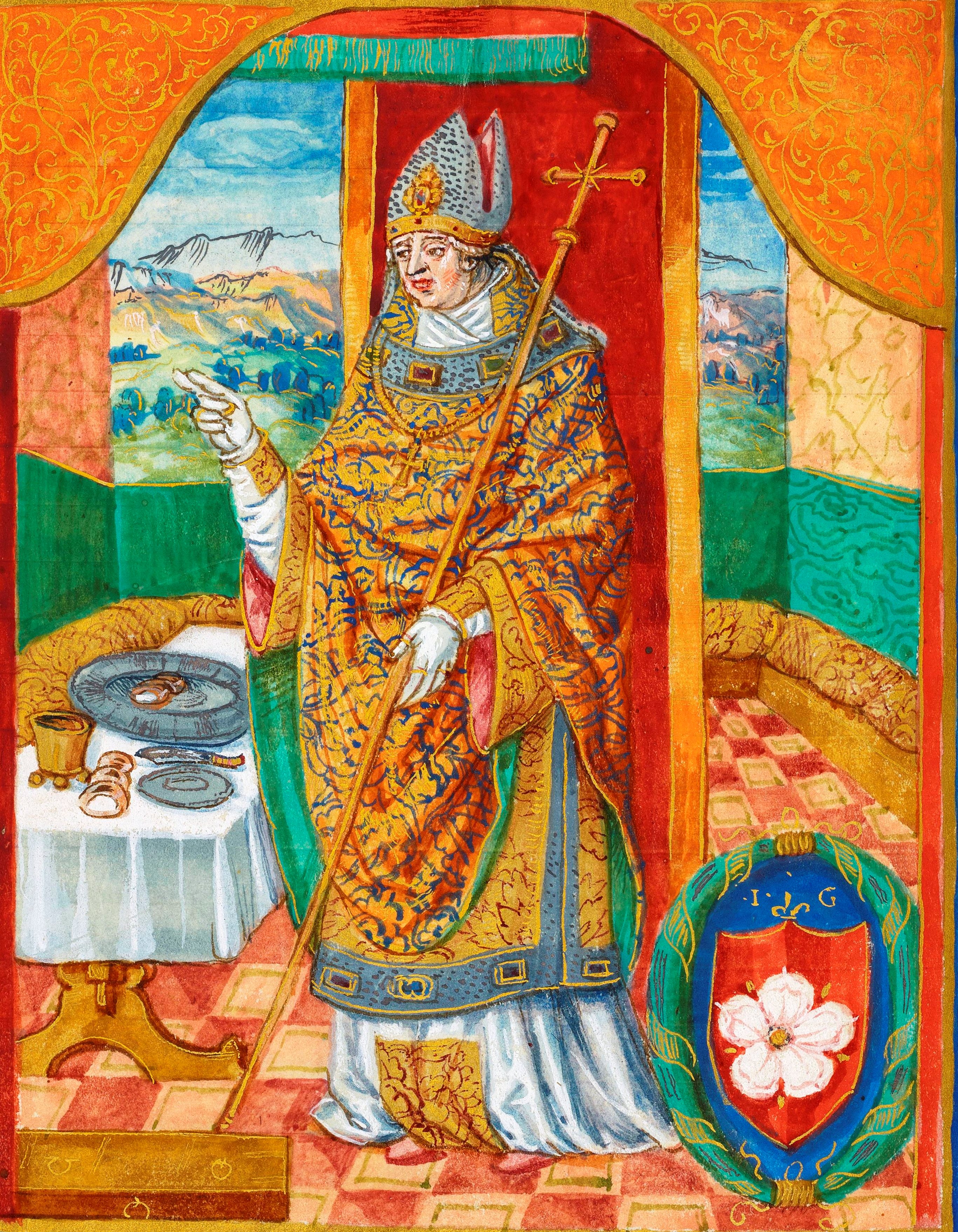 Fragment strony z rękopisu Jana Długosza "Catalogus archiepiscoporum Gnesnensium",  iluminowanego w Krakowie przez warsztat Stanisława Samostrzelnika w latach 1531-1535.
