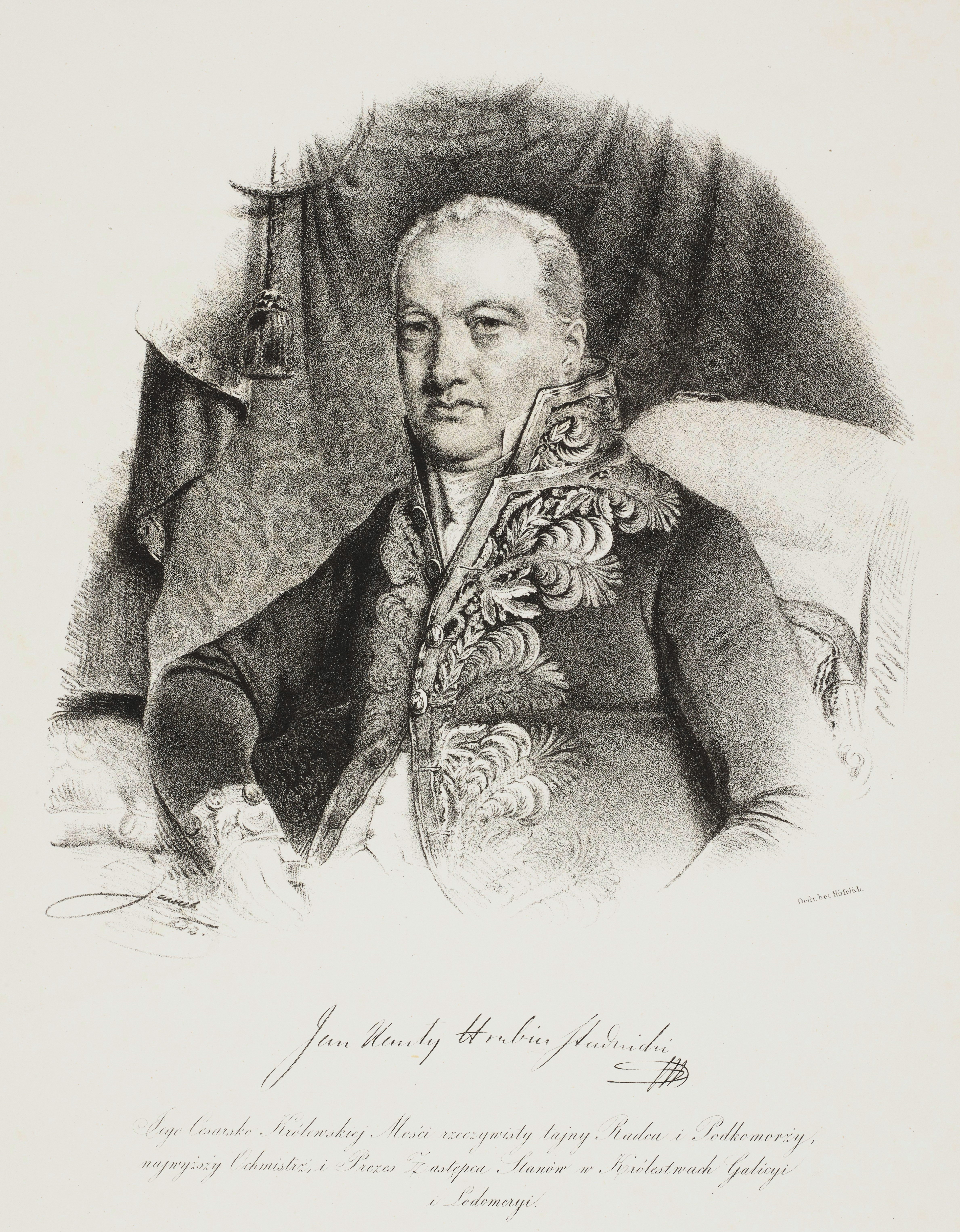, "Jan Kanty hrabia Stadnicki : Jego Cesarsko Królewskiej Mości rzeczywisty tajny radca i Podkomorzy, najwyższy Ochmistrz, i Prezes Zastepca Stanów w Królestwach Galicyi i Lodomeryi.", [w:] Polski słownik biograficzny, t. ,