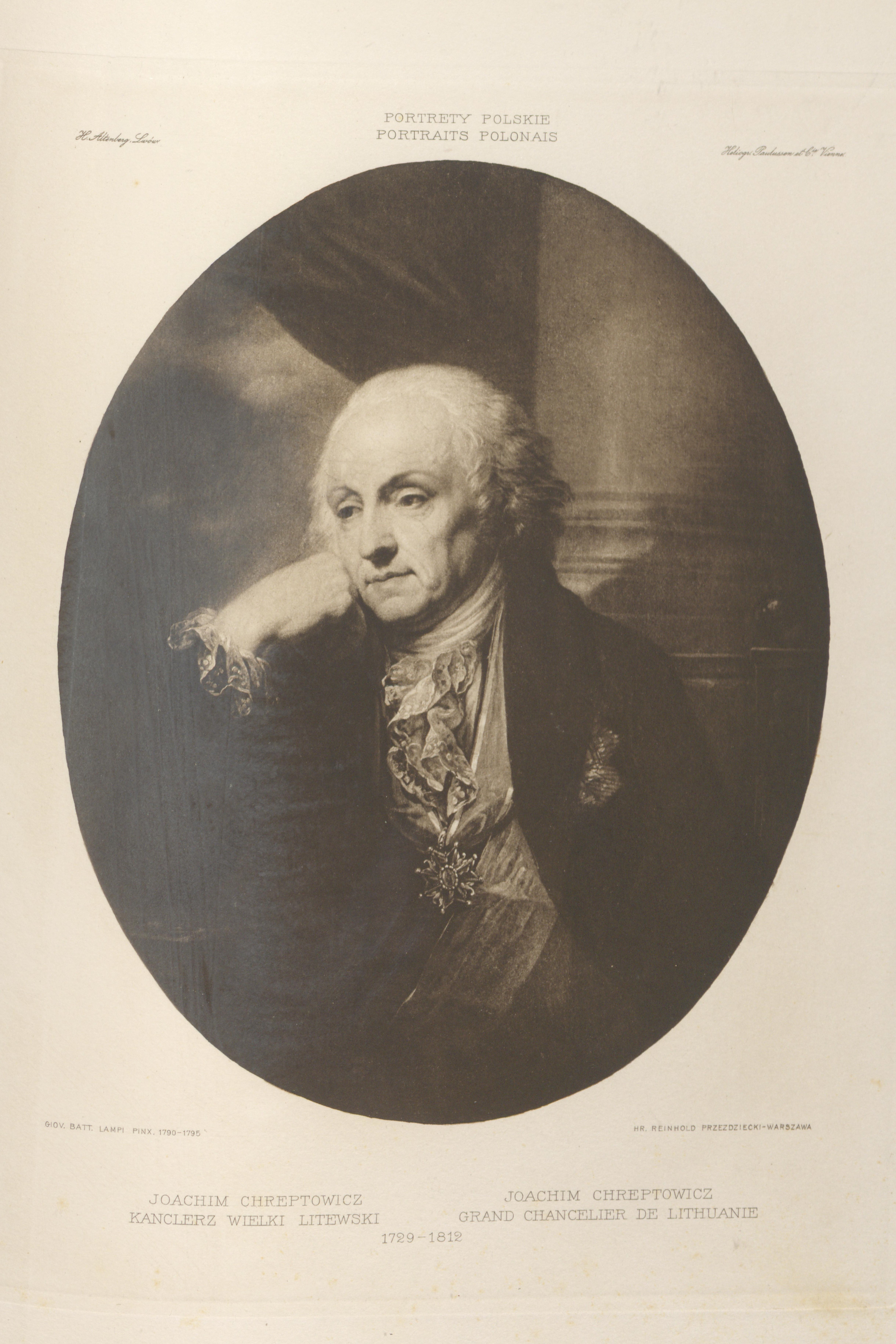 "Joachim Chreptowicz / Kanclerz Wielki Litewski" – heliograwiura wedle portretu pędzla Lampiego. share Podziel się facebook google + twitter linkedin clipboard envelope print quote picture add × Cytowane źródła Cytowanie źródła on-line, czyli Internetowego Polskiego Słownika Biograficznego "Joachim Chreptowicz / Kanclerz Wielki Litewski" – heliograwiura wedle portretu pędzla Lampiego., [online] Warszawa: Narodowy Instytut Audiowizualny [dostęp 28.02.2026]. Dostępny w internecie: http://www.biogramy.pl/a/foto/joachim-chreptowicz-kanclerz-wielki-litewski-heliograwiura-wedle-portretu-pedzla-lampiego Cytowanie wydania drukowanego, czyli Polskiego Słownika Biograficznego , "Joachim Chreptowicz / Kanclerz Wielki Litewski" – heliograwiura wedle portretu pędzla Lampiego., [w:] Polski słownik biograficzny, t. , IPSBID: ipsb-fo-117933 × Wyślij link do strony E-mail odbiorcy wiadomości: To pole jest wymaganeWpisz poprawny adres e-mail Twój adres e-mail: To pole jest wymaganeWpisz poprawny adres e-mail Podgląd wiadomości, która zostanie wysłana: Witaj, [Tutaj podany Twój e-mail] poleca Ci treść z iPSB (internetowym Polskim Słowniku Biograficznym) "Joachim Chreptowicz / Kanclerz Wielki Litewski" – heliograwiura wedle portretu pędzla Lampiego. × Dodaj do kolekcji wybierz kolekcję, do której chcesz dodać ten artykuł: lub wpisz nazwę nowej kolekcji, do której chcesz dodać ten artykuł: : To pole jest wymagane Dodaj do kolekcji Wybierz kolekcję Swoje kolekcje znajdziesz w profilu. Wystarczy kliknąć ikonę zębatego koła w górnym prawym rogu. Możesz je zobaczyć tu: moje kolekcje. × Dodaj do kolekcji Element został dodany do Twojej kolekcji. Swoje kolekcje możesz zobaczyć tu: moje kolekcje. × Dodaj do kolekcji Aby dodawać materiały do kolekcji musisz się zalogować. OPIS POSTACI POWIąZANE Heliograwiura w książce: Portrety polskie w XVI-XIX w.; T. 1, z. 3; Lwów (1911); niepaginowana karta ilustracyjna. W zbiorach Biblioteki Narodowej w Warszawie, sygn.: III 1.984.875 A Cim. Źródło kopii cyfrowej: POLONA.pl Postaci powiązane Joachim Chreptowicz (Litawor Chreptowicz) h. Odrowąż 1729-01-04 - 1812-03-04 kanclerz wielki litewski Jan Chrzciciel Lampi (starszy) 1751-12-31 - 1830-02-16 malarz więcej >> Zobacz zdjęcie w najwyższej jakości Źródło