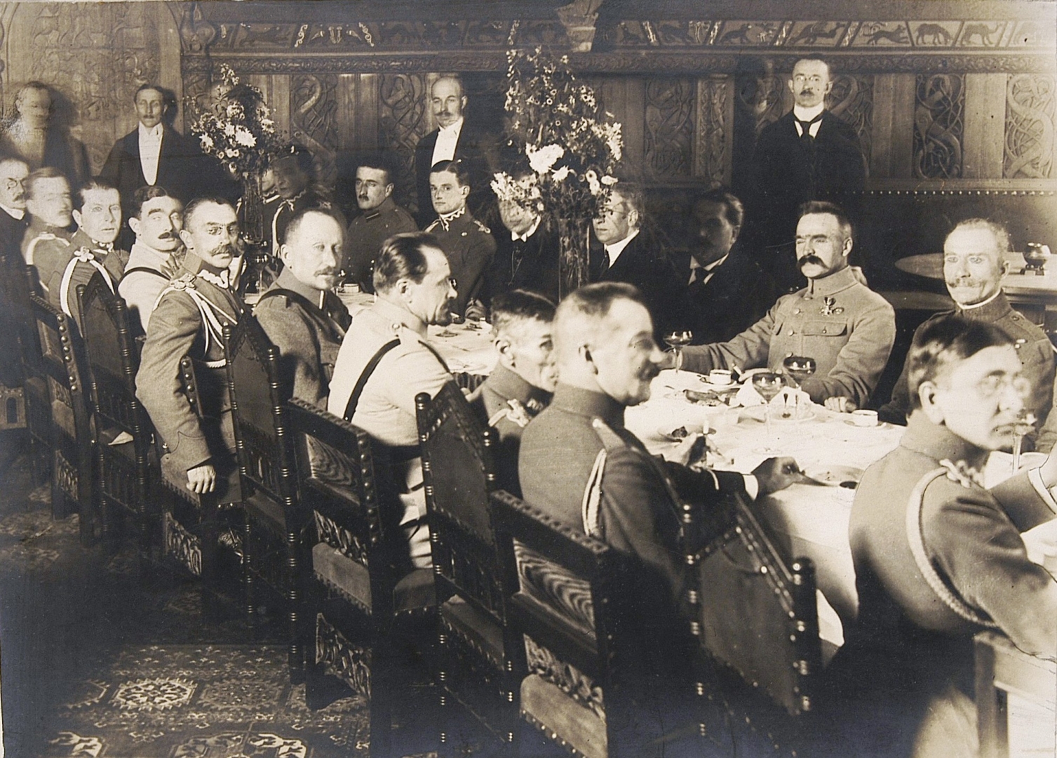 Zdjęcie przedstawia uroczysty obiad podczas wizyty Naczelnika w Zamku Cesarskim w Poznaniu. Po lewej stronie Piłsudskiego siedzi szef francuskiej Misji Wojskowej w Polsce gen. Paul Henrys, po prawej minister b. dzielnicy pruskiej Władysław Seyda, a naprzeciw siedzą generałowie: Jan Wroczyński, Zygmunt Zieliński, Józef Haller, Józef Dowbór Muśnicki, Józef Leśniewski.
