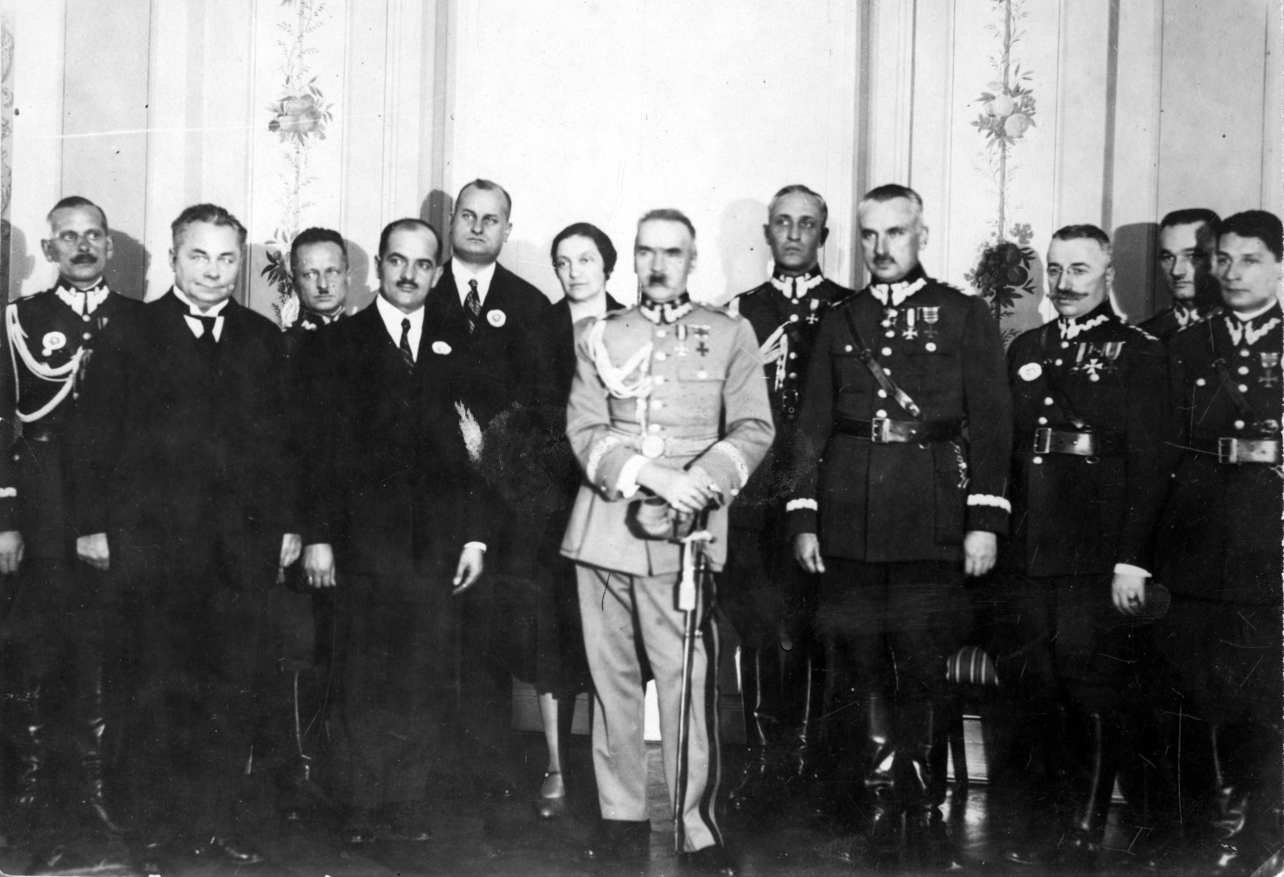 Marszałek Józef Piłsudski w otoczeniu swoich współpracowników. Widoczni m.in.: żona Aleksandra Piłsudska (na lewo za J.Piłsudskim), generał Gustaw Orlicz-Dreszer (na prawo za J.Piłsudskim), generał Kazimierz Sosnkowski (na prawo od J. Piłsudskiego), prezes Banku Gospodarstwa Krajowego Roman Górecki (4. z lewej), kpt. Tadeusz Caspaeri-Chraszczewski (1. z prawej).