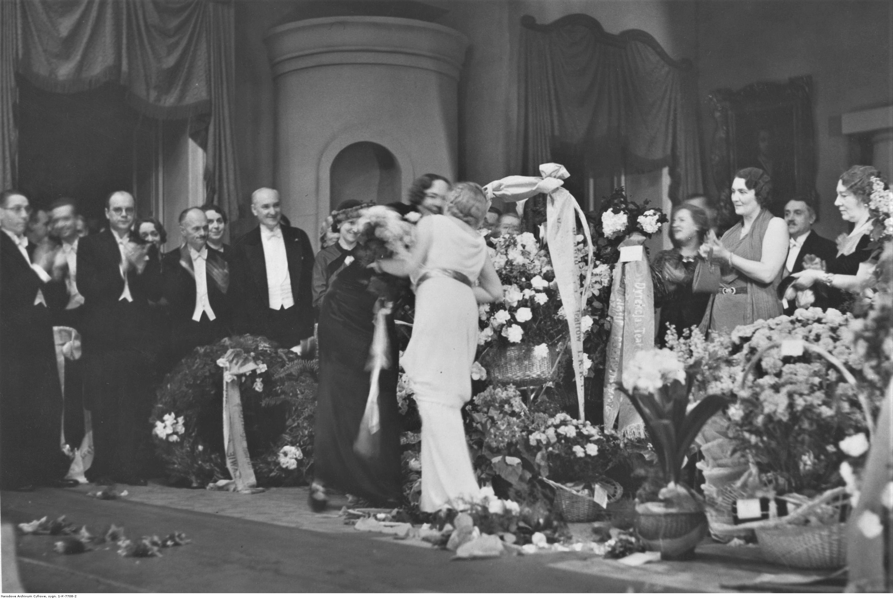 Aktorka Mieczysława Ćwiklińska na scenia Teatru Narodowego przyjmuje życzenia od kierownika Sekcji Kultury Wydziału Oświaty i Kultury Magistratu m.st. Warszawy Janiny Strzeleckiej.