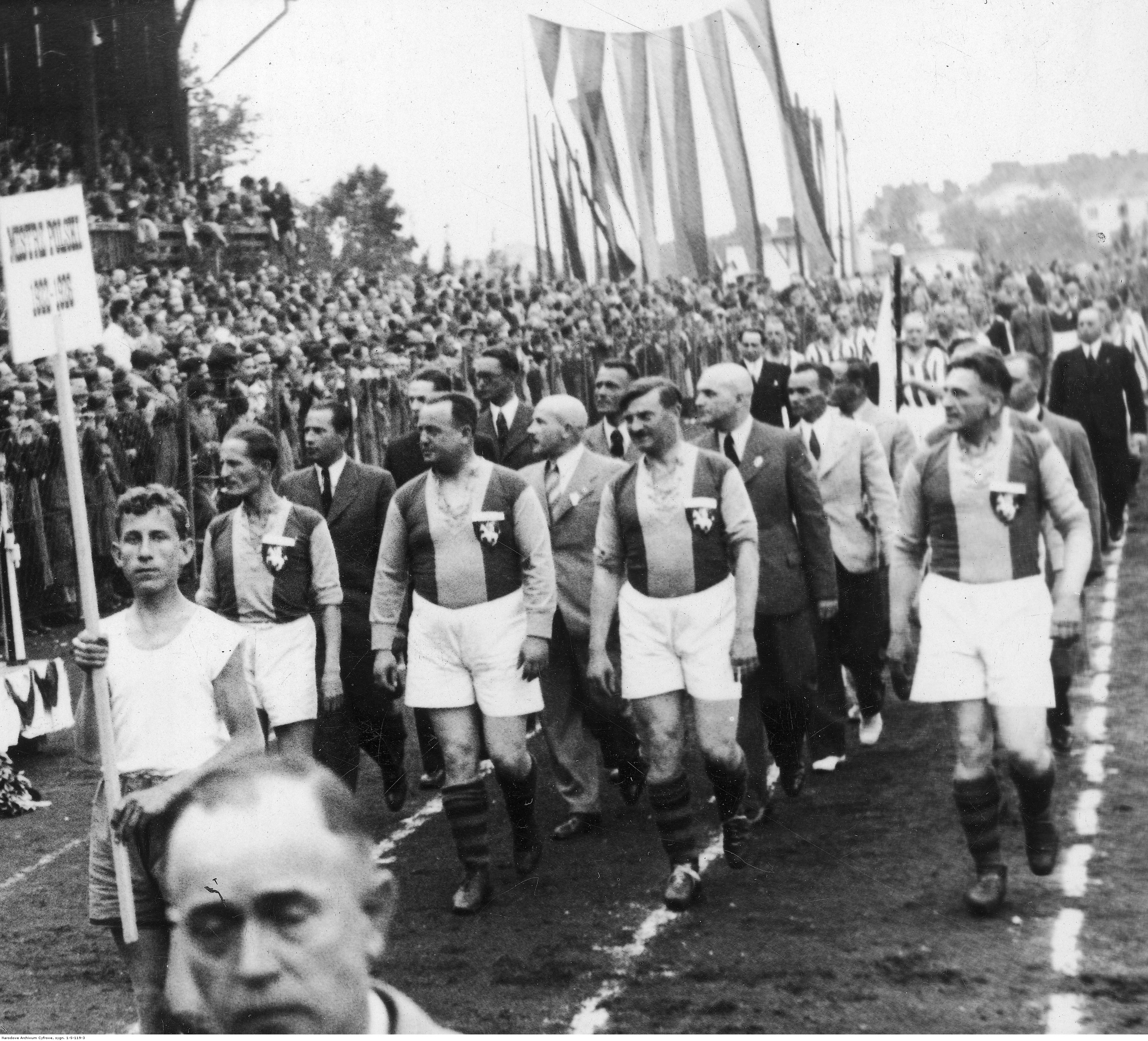 Członkowie Lwowskiego Klubu Sportowego "Pogoń" w defiladzie. Na przodzie idą: Wacław Kuchar (2. z lewej), Józef Garbień (1. z prawej), Mieczysław Batsch (3. z prawej).