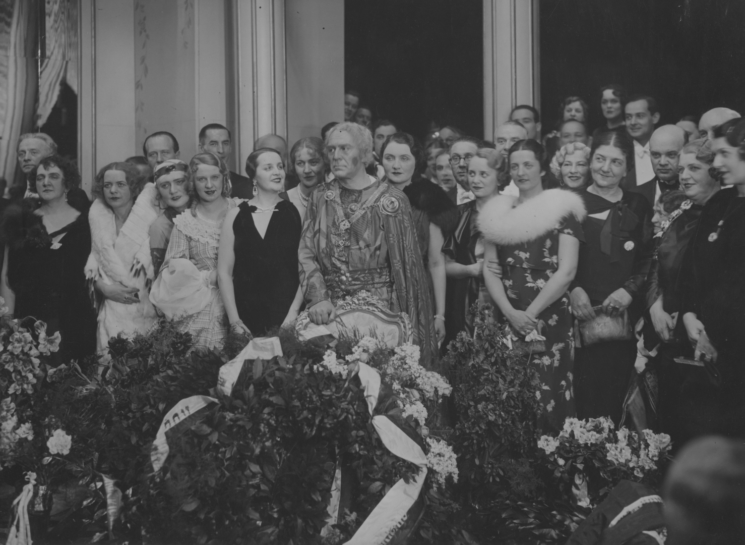 Jubilat (stoi w stroju scenicznym, za fotelem) w otoczeniu uczestników uroczystoci jubileuszowej. Widoczni m.in. aktorzy: Maria Gorczyńska (1 rząd, 5. z lewej), Jadwiga Smosarska (w sukni w kwiaty z kołnierzem z lisa), Karolina Lubieńska (trzyma pod rękę Jadwigę Smosarską), Władysław Grabowski (1. z lewej), Igo Sym (w głębi po prawej, w białej koszuli) i reżyser Arnold Szyfman (stoi za Karoliną Lubieńską, w okularach), aktorka Stanisława Wysocka (stoi obok Jadwigi Smosarskiej, trzyma torebkę).