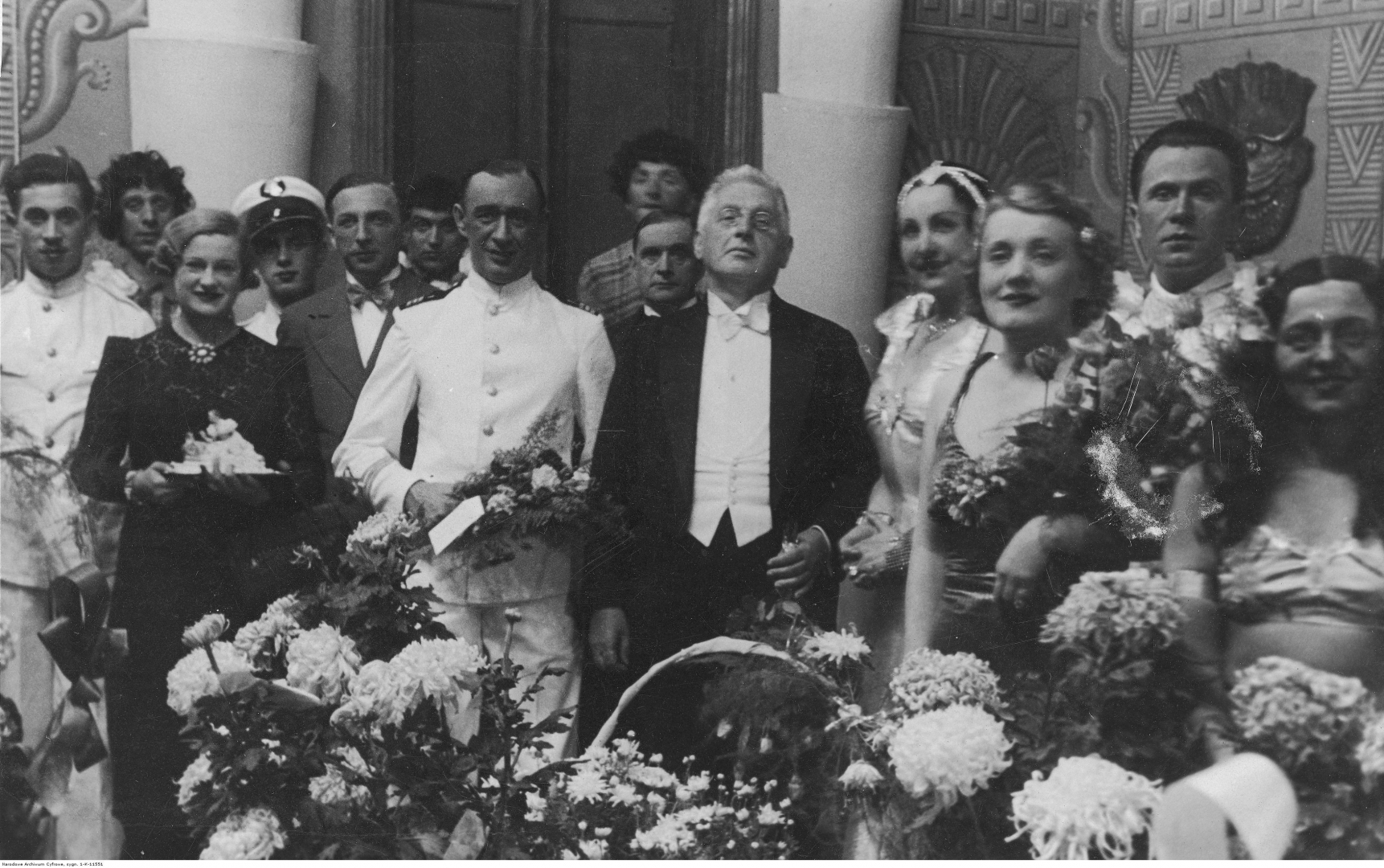 Fotografia wykonana w przerwie operetki "Kwiat Hawaju". Widoczni m.in. Kazimierz Dembowski, Barbara Halmirska, Karol Wyrwicz-Wichrowski, Maria Nochowicz, Maria Martówna i profesor Mieczysław Limanowski, który przemawiał w trakcie uroczystości.
