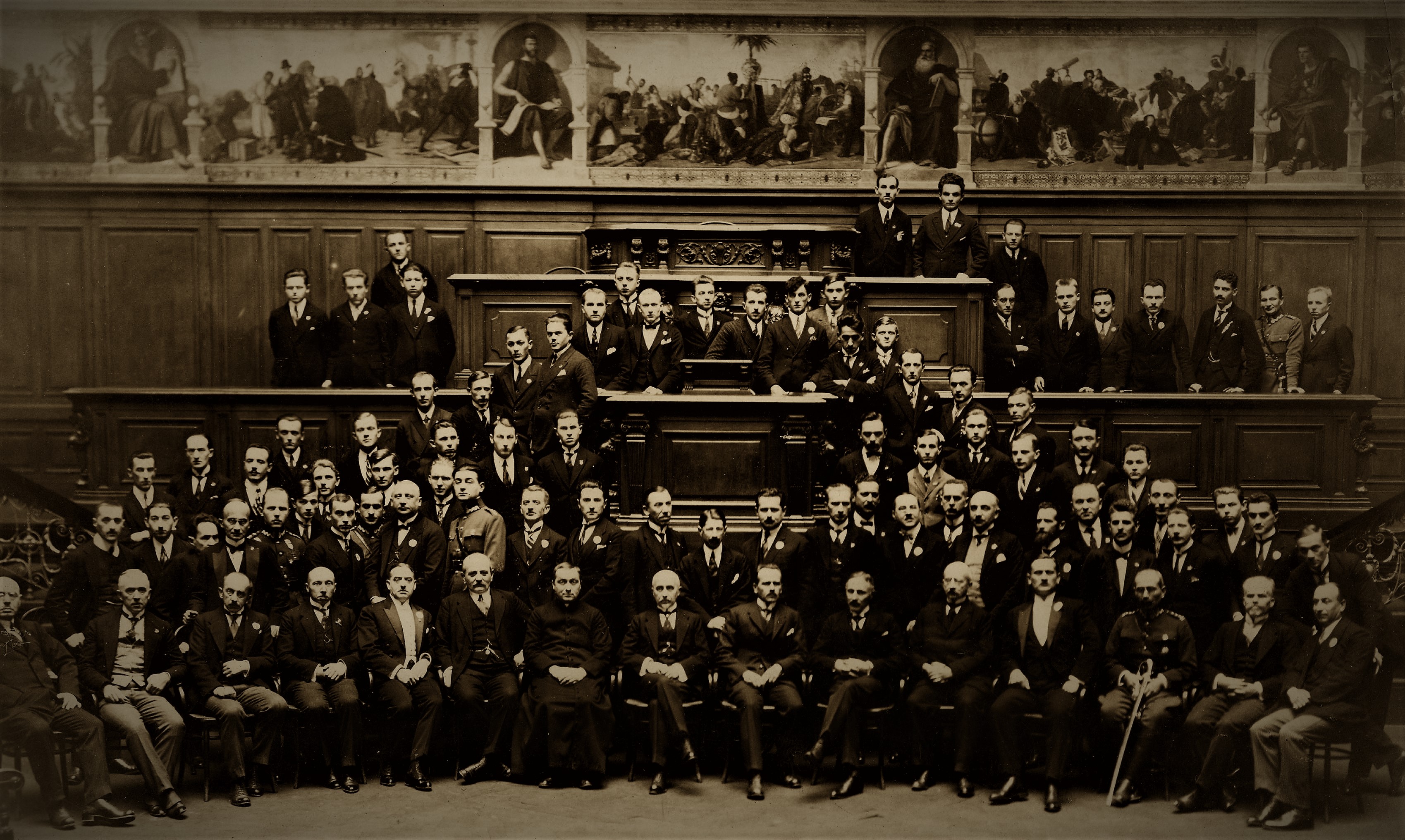 Fotografia grupowa członków chóru zrobiona z okazji jubileuszu. Widoczni m.in. rektor Uniwerystetu Lwowskiego Włodzimierz Sieradzki (siedzi 8. z prawej), kurator chóru Edmund Bonlanda (II rząd, w środku), długoletni dyrygent chóru Szczepański (siedzi 5. z lewej), pierwszy dyrygent chóru Jan Nowakowski (siedzi 4. z prawej).