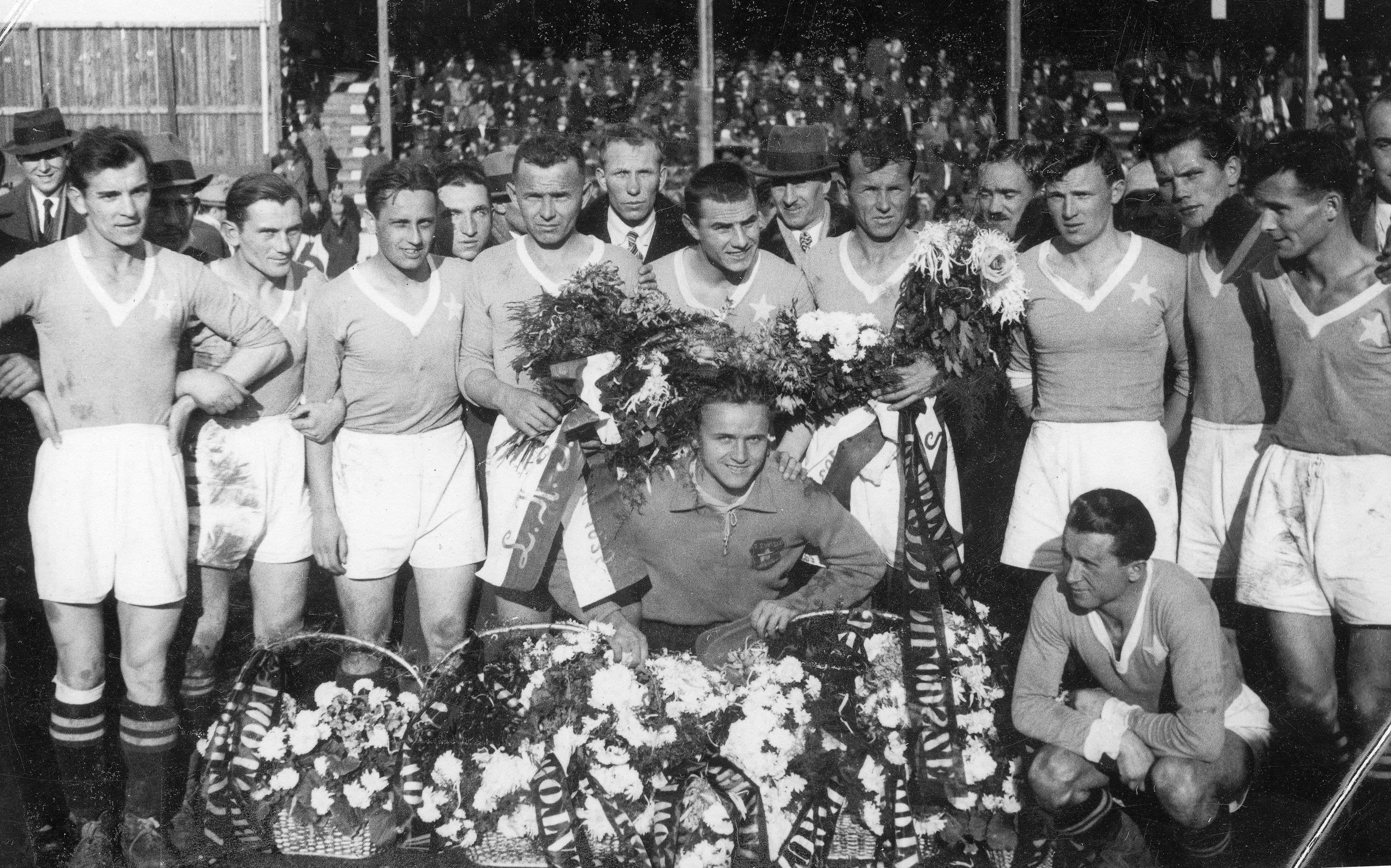 Piłkarze Jan Kotlarczyk (stoi z kwiatami po lewej) i Józef Kotlarczyk (stoi z kwiatami po prawej) w otoczeniu piłkarzy, delegatów związków i klubów sportowych na murawie boiska, po skończonym meczu Wisła Kraków - ŁKS. Widoczni m.in. Edward Madejski (bramkarz, kuca w środku), Artur Woźniak (stoi 3. z lewej).