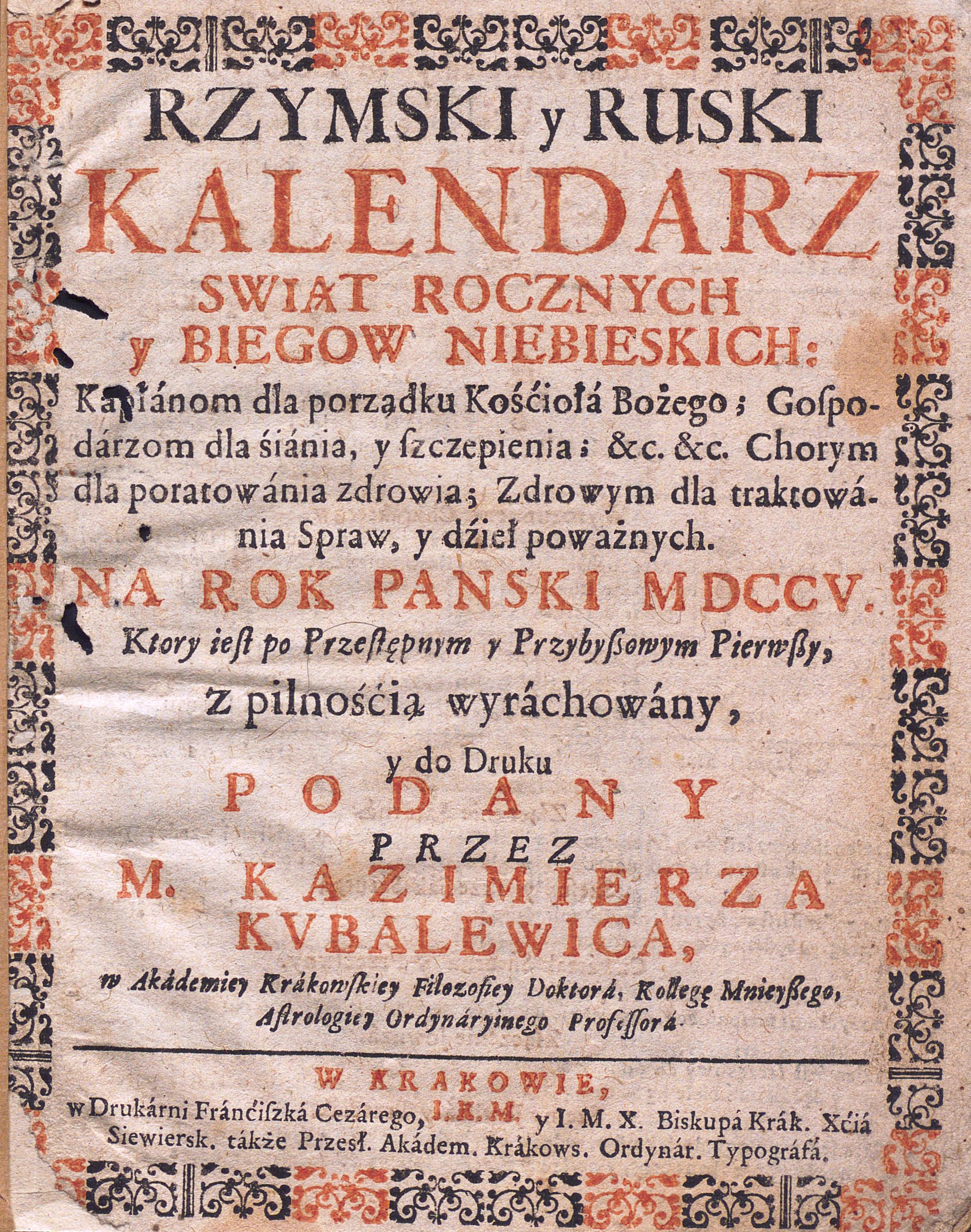 Strona tytułowa kalendarza wydanego w Krakowie przez Drukarnię Franciszka Cezarego J.K.M. y Biskupa krak.