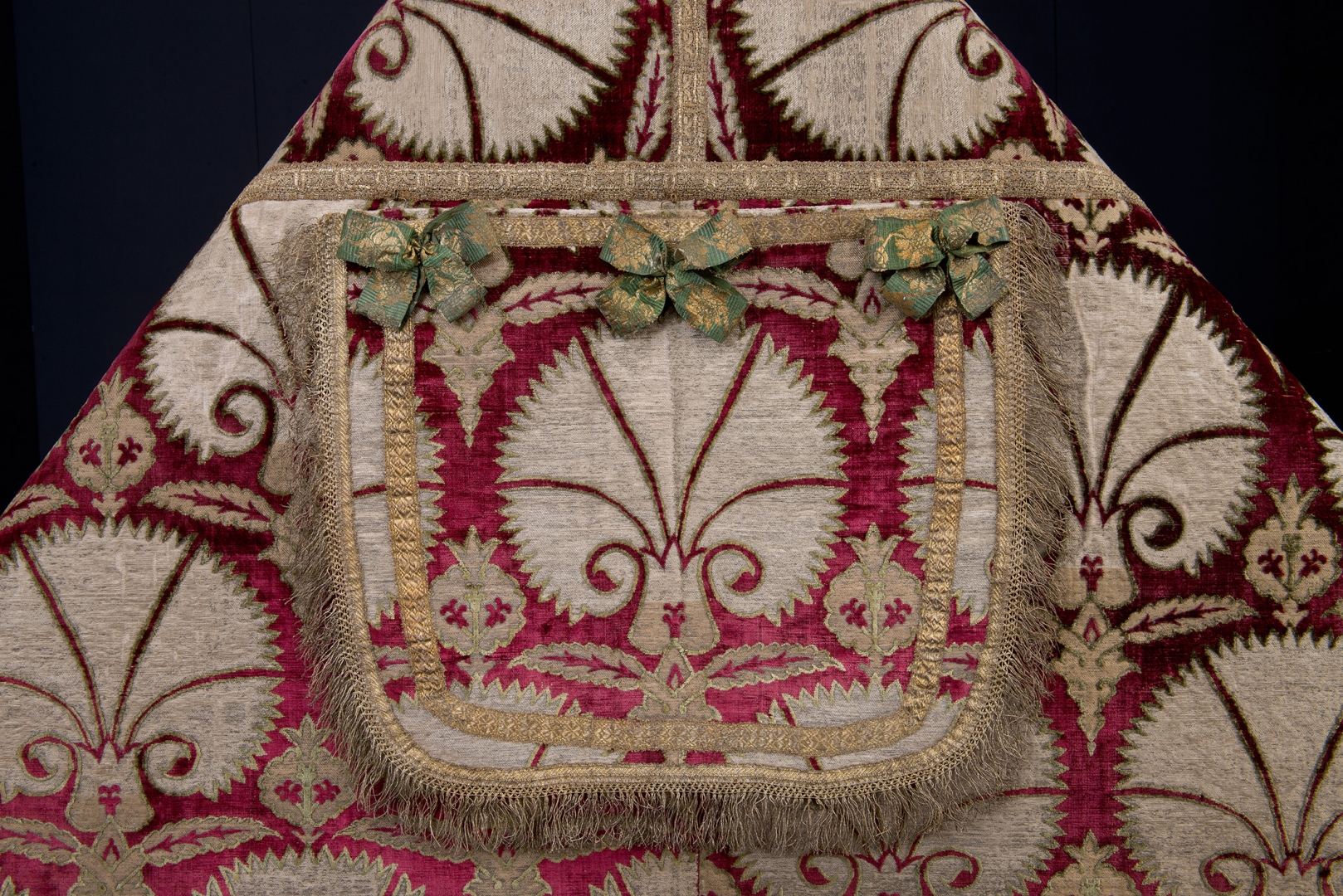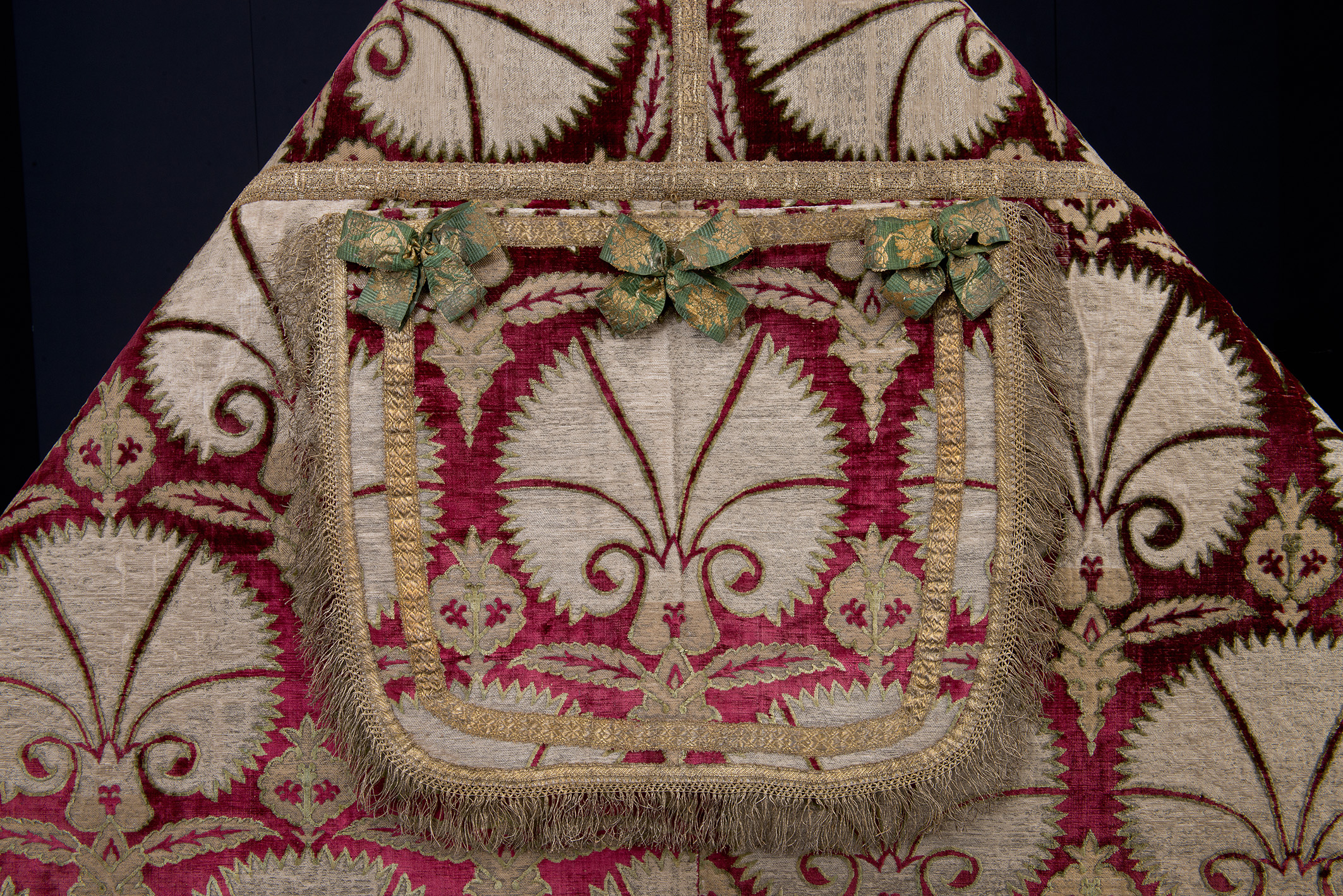 Kapa jest wyrobem tureckim z XVI–XVII w. Wykonano ją z brokatu aksamitnego: jedwab (aksamit cięty), broszowany w partiach wzoru nicią jedwabną ze srebrnym oplotem metalowym, nici metalowe (galony i frędzle na kapturze oraz koronki), jedwab (kokardy na kapturze), bielone płótno lniane (podszewka), zielona tafta jedwabna (fragmenty pierwotnej podszewki). Ma wymiary 129 x 278 cm.