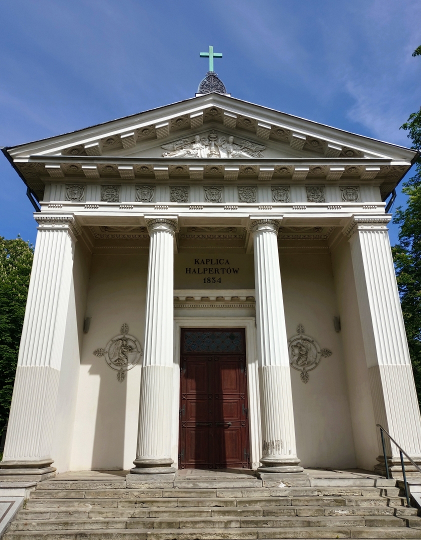 Ta monumentalna budowla ufundowana została przez Marię ze Słuckich Halpertową dla uczczenia pamięci jej męża Salomona jako mauzoleum rodzinne. Zaprojektowana została przez Adolfa Schucha. Prace nad budową zakończono w 1835 roku. Na uroczystej konsekracji kaplicy w marcu odegrano okolicznościową kantatę, napisaną specjalnie przez Józefa Elsnera do słów Henryka Bogumira Spiessa, który w trzy miesiące później w czerwcu 1835 roku jako pierwszy został wyprowadzony z tej kaplicy na miejsce wiecznego spoczynku. W latach 60. XIX wieku kaplica została przebudowana przez Jana Kacpra Heuricha. W podziemiach kaplicy pochowani są Maria ze Słuckich Halpertowa, druga żona Salomona Halpera, a także muzyk i dyrektor teatrów warszawskich Borys Halpert.