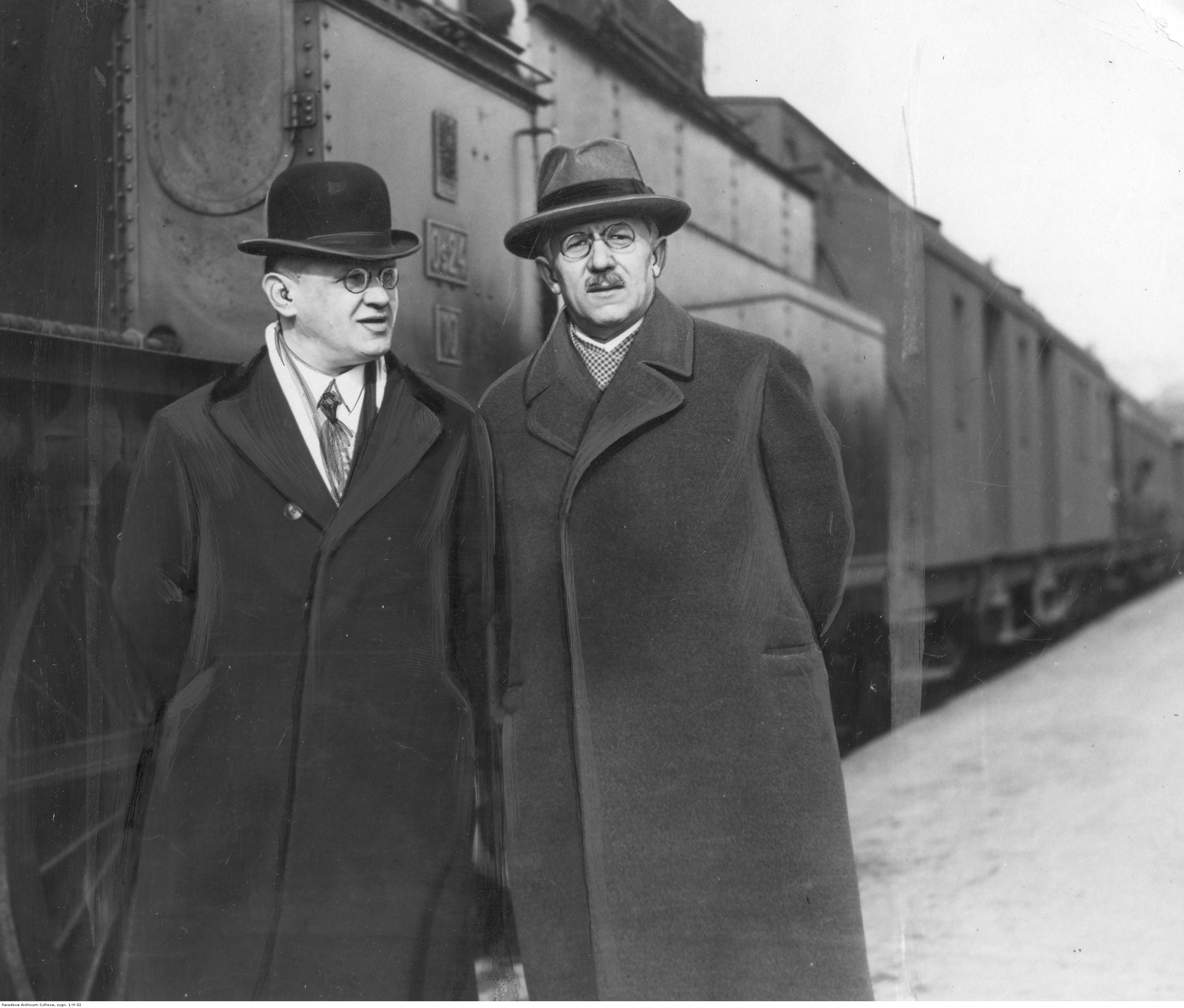 Profesor Politechniki Lwowskiej K. Bartel (z prawej) w towarzystwie profesora Politechniki Lwowskiej W. Broniewskiego na Dworcu Głównym w Warszawie.