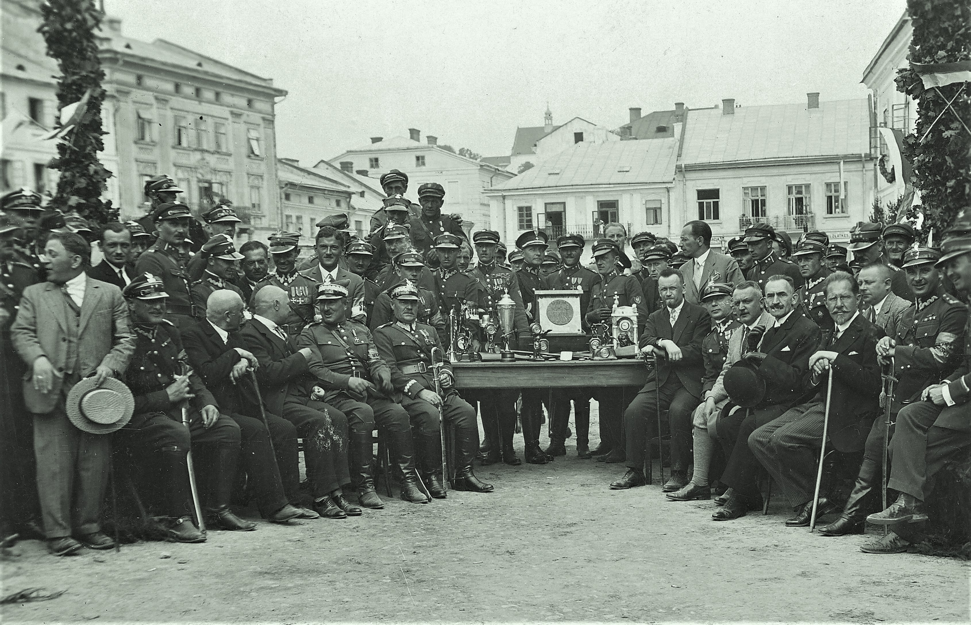 Z lewej strony stołu od prawej: gen. Bolesław Popowicz, gen. Stanisław Dowoyno-Sołłohub, starosta Koczyński, burmistrz Wiszniewski, płk Eugeniusz Zabawski. Z prawej strony stołu m.in. działącze Związku Strzeleckiego: Henryk Schmal (1 z lewej), Władysław Weigel (4 z lewej). Widoczni także: działacz Związku Strzeleckiego Kruk-Kolbuszewski (1 z prawej za stołem), inicjator marszu Artur Frey (2 z prawej za stołem), por. Wacław Lewkowski (za gen. Popowiczem).