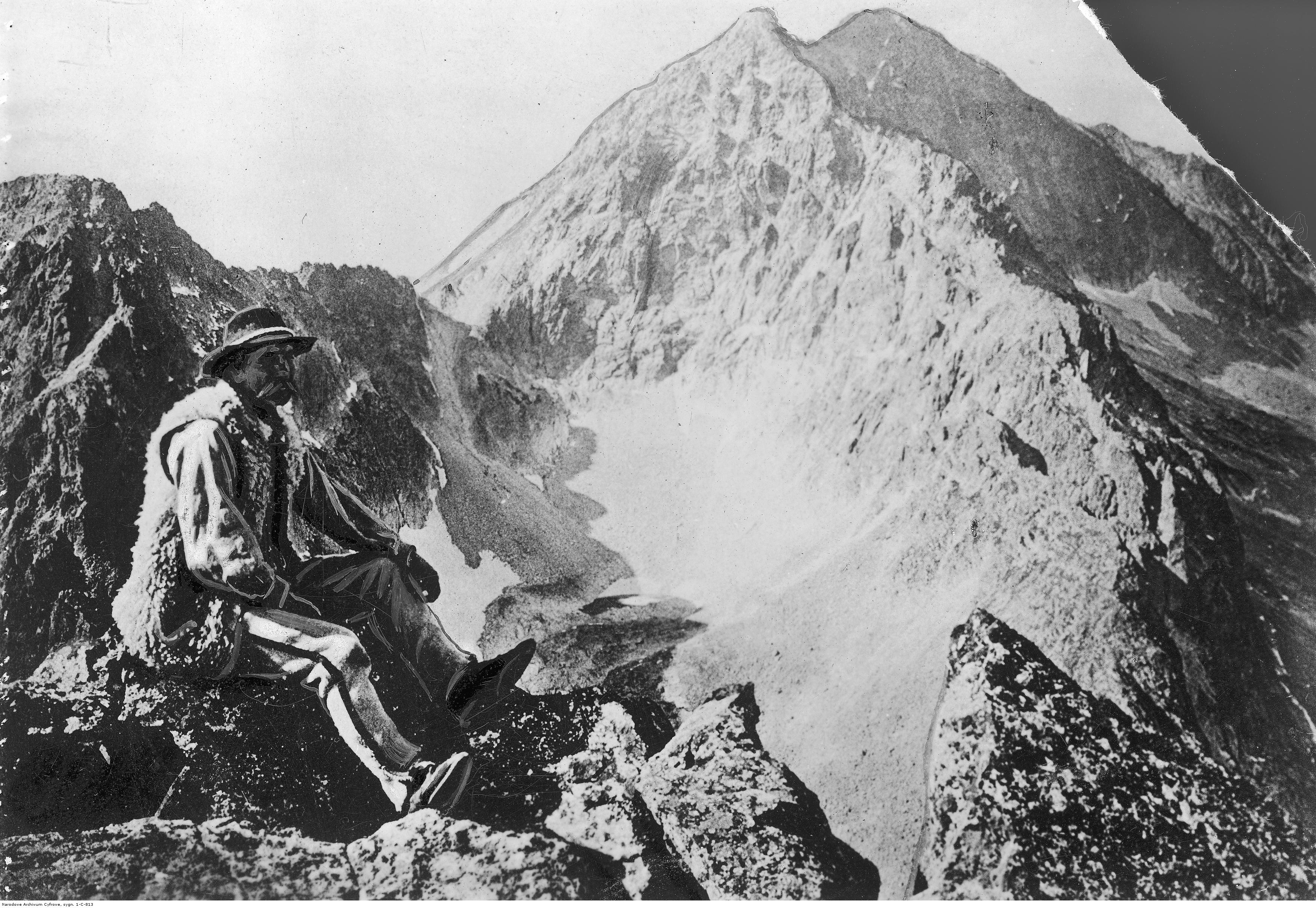 , Klemens Bachleda siedzący na skale z widokiem z Pośredniej Grani na Lodowy., [w:] Polski słownik biograficzny, t. ,